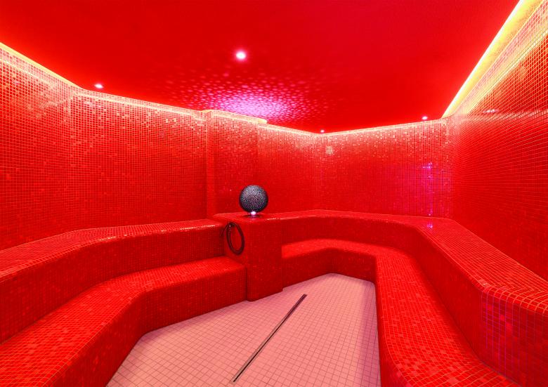 Für eine harmonisch-weiche Farbwelt in der Badehalle sorgen die 11,5 x 24 cm großen weiß-bläulichen Schwimmbadfliesen der Serie Chroma Pool im Zusammenspiel mit insgesamt 2800 m² der unglasierten sandweißen, 5 x 5 cm großen Bodenfliesen der Serie Plural. Das Kleinformat erfüllt nicht nur zuverlässig die notwendige Rutschhemmungsklasse R10/B, sondern erleichtert auch die ästhetische Ausbildung von Anschlüssen an andere Bauteile (z. B. Abläufe, Stützen, Rinnen) oder Entwässerungsflächen mit Gefälle. Diese Fliesen prägen nahezu sämtliche Bodenflächen der Badelandschaft – die Beckenumgänge ebenso wie den Gastronomiebereich der Badehalle und das Dampfbad. Gezielte Akzente setzen hingegen die 2,5 x 2,5 cm großen Mosaikfliesen der Serie Fresh mit der Mosaikmischung coral red-mix. Die stimmig nebeneinander gesetzten Rottöne weisen bei den Sitzbänken, die zugleich die Beckenbereiche trennen, auf deren Funktion als wärmende Aufenthaltsfläche hin. Eine eindrucksvolle Wirkung erzeugt coral red-mix auch in dem als steinerner Kubus am Rand der Badehalle platzierten Dampfbad: Dessen Inneres präsentiert sich dank Sitzstufen und Wänden in dieser Mosaikmischung als leuchtend rot glühender Kristall, in dem sich die Besucher nach dem Bad im kühlen Nass aufwärmen können. In beiden Fällen wurden die Sitzflächen in der trittsicheren Version R10/B ausgeführt, weil nicht auszuschließen ist, dass auch sie begangen werden.