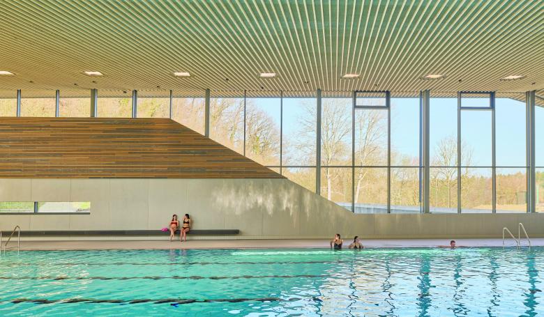 Angesichts der Lage des Sport- und Freizeitbads am Rand des Schwaketen- und Mainauwalds entwickelten Behnisch Architekten ein Projekt, dessen unverwechselbares Erscheinungsbild vor allem auf einer natürlichen Farb- und Materialwelt beruht. Die Badelandschaft unter dem skulptural gefalteten Dach ist dabei vor allem vom harmonischen Zusammenspiel der Keramikfliesen von Agrob Buchtal geprägt.