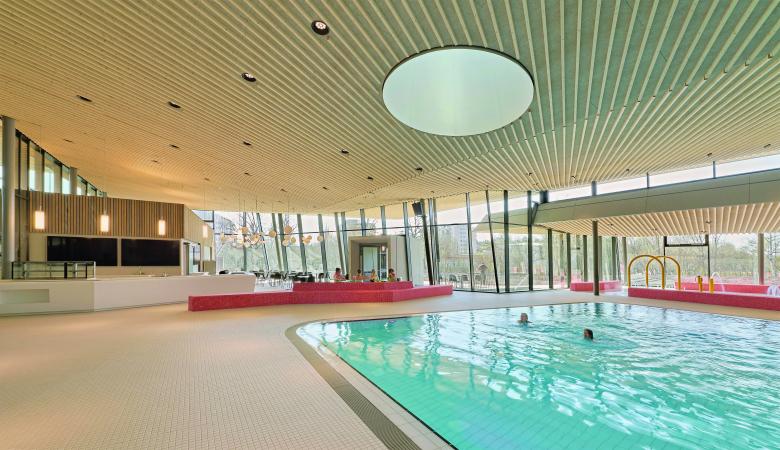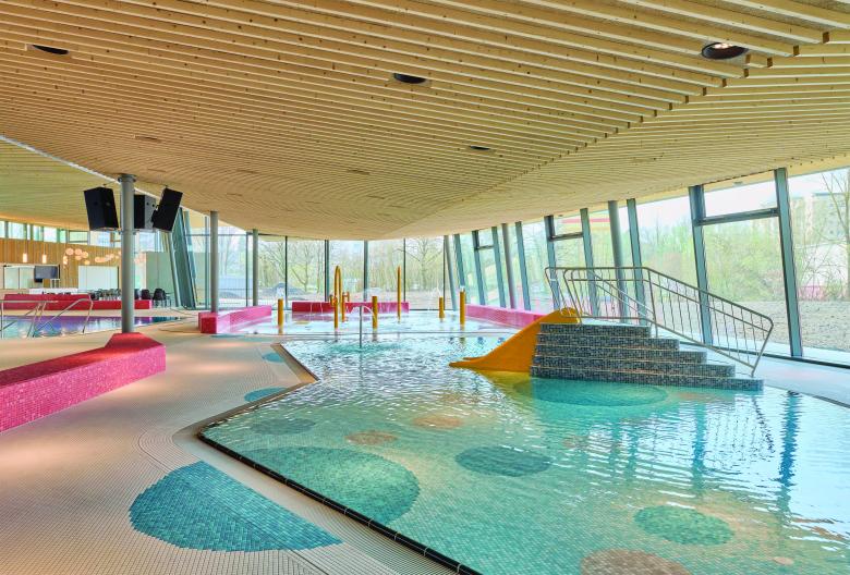 Nach Passieren von Umkleiden und Duschen gelangen die Badegäste in einen Durchgang mit 2,5 x 2,5 cm großen Mosaikfliesen der Serie Fresh an Boden und Wänden. Die in noblen Blautönen schimmernde Mosaikmischung midnight blue-mix verleiht diesem Zwischenbereich eine gewisse Mystik und lässt den Weg zur lichtdurchfluteten Weite der offenen Badelandschaft zum Erlebnis werden. Dass sich die Besucher nach Ankunft in der Badehalle sofort wohlfühlen, hat mehrere Gründe. Erstens finden sie sich in derselben natürlichen Farb- und Materialwelt wieder, die sie bereits vom Eingangsbereich kennen. Zweitens überblicken sie von hier aus sämtliche Wasserattraktionen und dank der großflächigen Glasfassade auch das Außengelände. Und drittens erleben sie die aus drei gefalteten Streifen zusammengesetzte Dachlandschaft als faszinierendes dreidimensionales Raumgefüge, unter dem sehr unterschiedliche Bereiche entstehen. Während das hoch über den Schwimmbecken liegende Dach luftige Großzügigkeit erzeugt, spendet es am Kleinkindbecken – wie schon in den Umkleiden – schützende visuelle und akustische Geborgenheit.