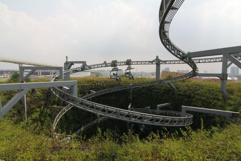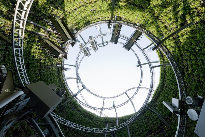 Der zweite, nach oben offene Zylinder ist sein komplementärer Gegensatz: Eine üppig mit Farn, Efeu und Moos bewachsene Schlucht. Das herabtropfende Wasser sammelt sich in einem Wasserbecken, das den gesamten Zylinderboden ausfüllt, das Bild und damit das Gefühl der Tiefe multipliziert. Die Schlucht ist Auftakt einer kurzen Reise durch eine Collage der Schweizer Landschaften. Mit der Sesselbahn schwebt der Besucher steil hinauf in die helle, weite Landschaft auf dem Dach: vor dem Hintergrund von Wolkenkratzern und Strassenschluchten liegt die farbenfrohe Idylle der Schweizer Bergwiese. Über die Ruhe blühender Matten und grüner Wiesen schweben die Besucher durch eine abstrakte Hügellandschaft, die an die voralpine Welt erinnert, ehe die Bahn sie schliesslich durch die wilde Schlucht zurück ins ‹Unterland› bringt.