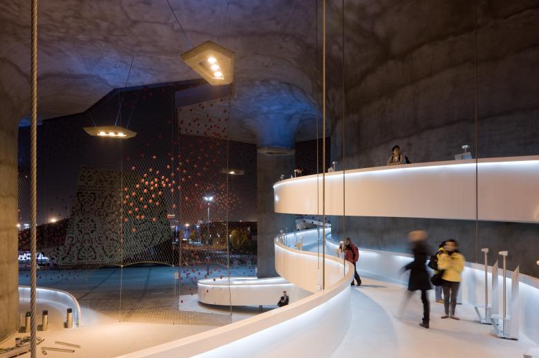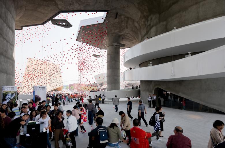 Der Pavillon präsentiert die Schweiz auf 4000 Quadratmetern als Symbiose von Stadt und Land. Innen und Aussen verschränken sich wie Siedlung und Landschaft in zwei Zylindern, die die architektonische Grundstruktur bilden. Der erste Zylinder fasst die Ausstellungsflächen. Er steht mit harten, kantigen Oberflächen und hoher inhaltlicher wie akustischer Dichte für die urbane Seite der Schweiz.