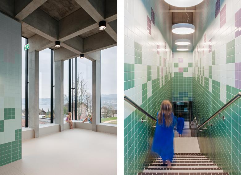 Wenngleich die mit farbigen Platten gestalteten Wandoberflächen den Bau unmissverständlich in ein Schwimmbad verwandeln, so bleibt doch der massive, rohe Charakter der alten Anlage weitgehend erhalten. Im Untergeschoss wird die Betondecke mit einem Schutzanstrich versehen, die Leitungsführungen bleiben sichtbar, Gänge und Umkleiden sind diffus beleuchtet. Nur die über die belichtete Front hingestreckte Eingangshalle scheint herausgeschält aus der Oberfläche eines tief im Hang steckenden, massiven Betonkörpers.