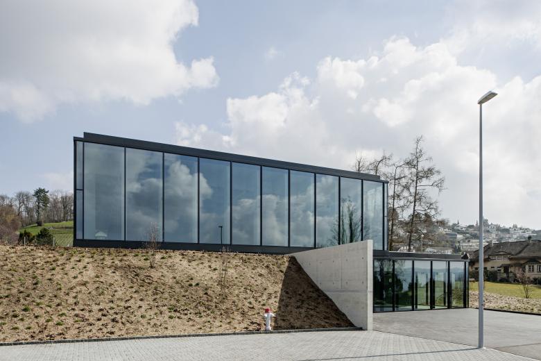 Die Aufgabenstellung sah vor alle Bereiche des Bades in dem unterirdischen Schutzbau unterzubringen. Das Team bestehend aus Pöyry Schweiz AG und illiz architektur konnte mit einem alternativen Ansatz die Auslober überzeugen: Anstatt das Erdreich unter der Truppenunterkunft zur Schaffung des notwendigen Beckenvolumens aufwendig auszuhöhlen, wird das Becken in die bestehende unterirdische Kubatur nur hineingehängt. So liegt der Wasserspiegel ebenerdig im Gelände und ermöglicht einen weiten Ausblick auf den Zürichsee. Im unterirdischen Bestand werden neben Becken und Hubboden, die Haus- und Schwimmbadtechnik sowie die Eingangshalle mit anschliessendem Garderobentrakt untergebracht. Die eigentliche Badehalle wird als lichtdurchfluteter Pavillon über das neue Becken gestülpt und markiert den städtebaulichen Abschluss des Schulareals.