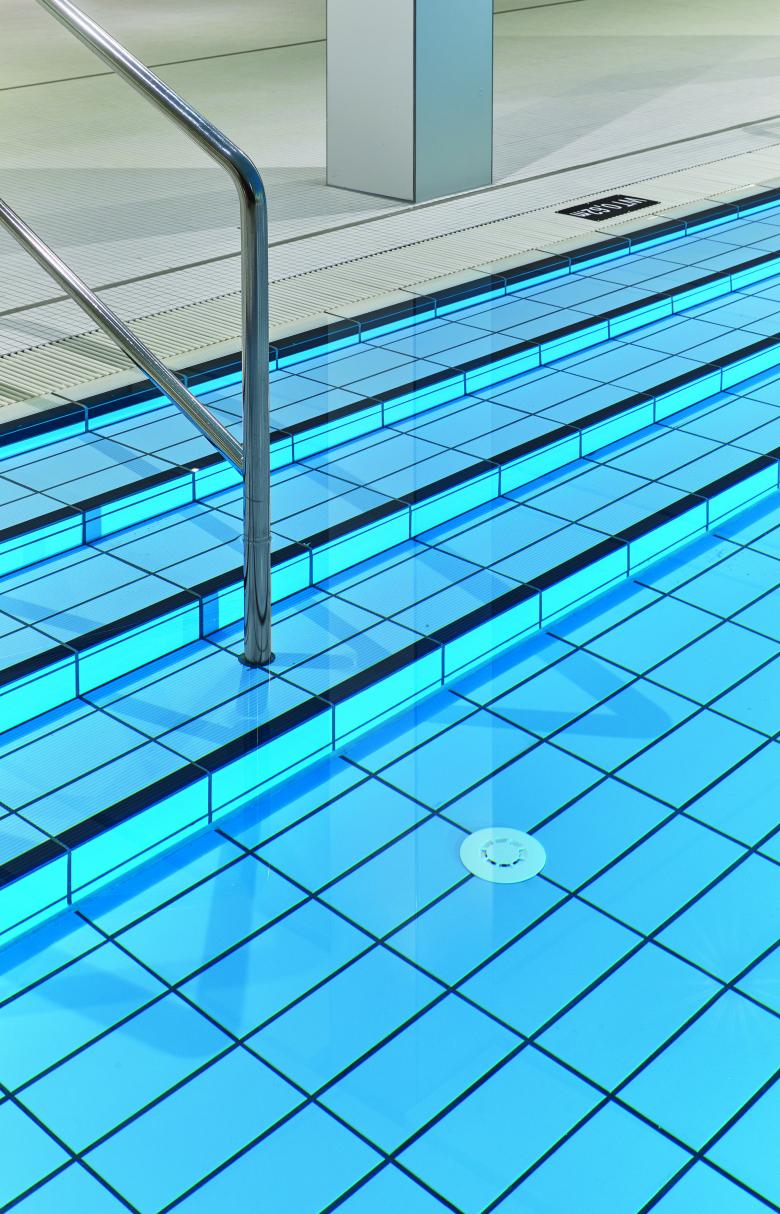In puncto Sicherheit macht die Serie Chroma vor, wie es geht: Ihre Keramikfliesen bringen die Trittsicherheitsklasse der Kategorie C mit und sorgen besonders in rutschgefährdeten Bereichen wie den ins Wasser führenden Treppen für unfallfreien Beckeneinstieg.