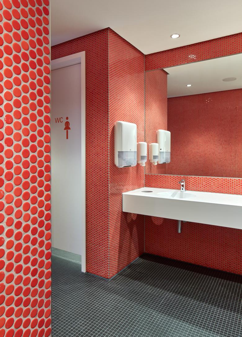 Die korallenroten Keramikfliesen an den Innenwänden der frisch sanierten und erweiterten Hamburger Alster-Schwimmhalle sind ein echter Hingucker. Sie heben sich deutlich ab vom Blau der Becken, bilden mit ihrer warmen, man möchte fast sagen, feurigen Farbe einen auffallenden Kontrast zum Element Wasser. Was sich hier an den Wänden der verschiedenen Bereiche, in Umkleiden und Duschen, an Säulen und Trennwänden entlangzieht wie ein Designleitfaden, sind Keramikfliesen aus der Serie Loop von Agrob Buchtal. Beim Näherkommen erkennt man, dass sie aus unzähligen runden Mosaiksteinchen bestehen.