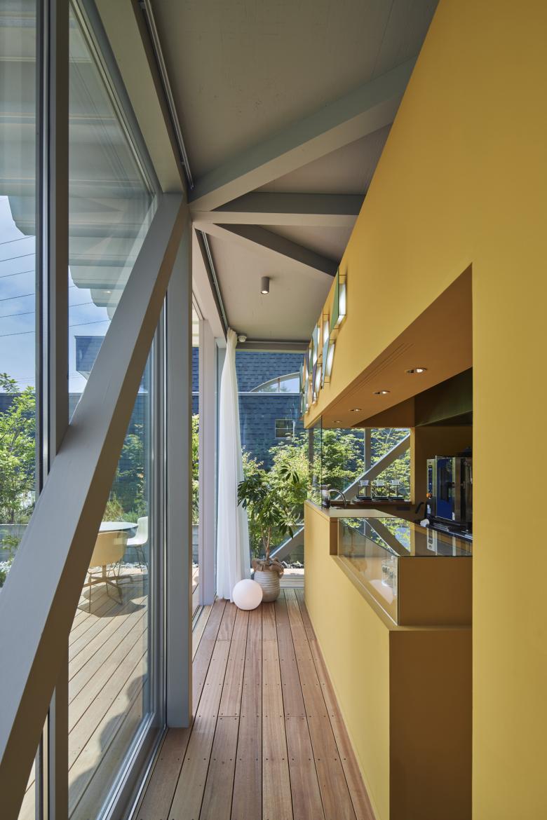 木製小径材による柱、筋交い、梁により構成される華奢なフレームに大きなスパンを負担できる折板屋根を架け、外周をガラスで囲い込んだ。構造材は全てライトグレーに塗装され、「木造らしさ」をあえて消す。それでもなお感じられる材料の模様や柔らかさ、暖かさは空間全体に空模様のような雪景色のような曖昧性と軽快性を漂わせる。