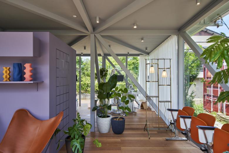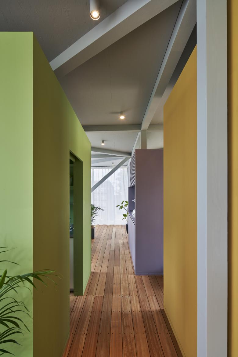 そんな空間に消毒室やレントゲン室、トイレ、カフェ厨房といった明確な機能室をカラフルな箱として配置し、それらにより空間を柔らかく区画した。カラフルな機能箱は建物構造から解放されているため、カフェの拡大や診療ユニットの増設、異用途の介入、用途の刷新などといった将来の変更に対し柔軟に経済的に対応することが可能である。