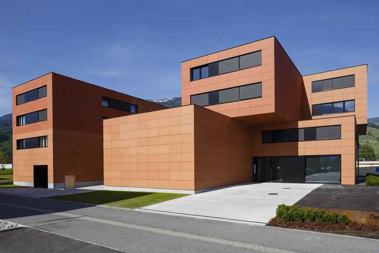 Weinkultur surplus – Im Norden von Buchs liegt zwischen Gewerbegürtel und Wohnquartier die Secli Weinwelt. Der Wohn- und Geschäftskomplex setzt sich aus 15 Quadern zusammen. Sie wirken wie gestapelte Weinkisten und erstrecken sich über jeweils zwei Etagen. Das mit Terrakotta umhüllte Bauwerk weckt Assoziationen zur Weinwelt und übersetzt die Bedürfnisse der Auftraggeber in Form und Material.