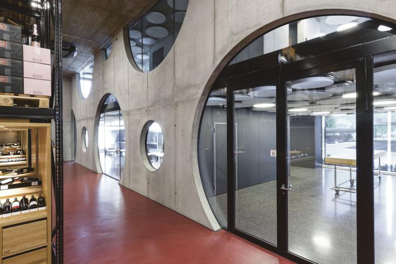 Wie die Flaschenböden im Inneren eines Weinkartons verteilen sich runde Glasscheiben in zwei Grössen über die Wand, die Foyer und Büro vom kavernenartigen zweigeschossigen Hochregallager trennt. Dort befinden sich die beleuchteten Präsentationsnischen – sortiert nach Provenienz der Weine. Im südlichen Bereich des Gebäudes liegen sechs grosszügige Wohnungen.