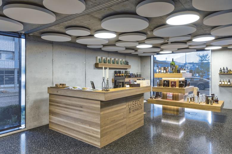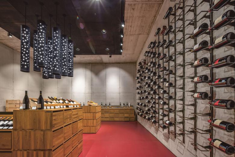 «Die Kathedrale des Weins» bildet mit dem Grossflaschenlager das Herzstück der Anlage. In diesem allseitig umschlossenen Forum erfahren die Besucherinnen und Besucher das Volumen über die beeindruckende Raumhöhe. Im ersten Obergeschoss liegen die transparent und hell gehaltenen Büros. Ein ins Lager eingeschobener gläserner Besprechungsraum gewährt wechselseitige Einblicke: in die Welt der Weine und in den mit ihr verbundenen, von wahrer Passion getragenen Arbeitsalltag.
