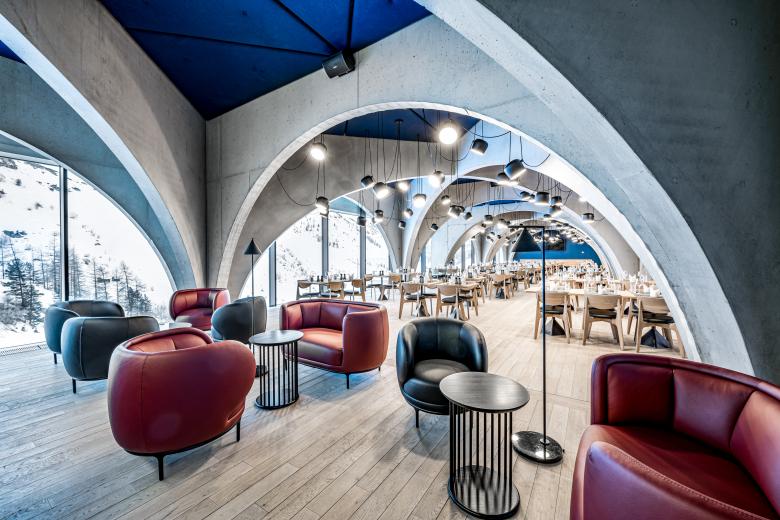 Markante Merkmale der strukturellen Elemente, Sichtbetonbögen in verschiedene Richtungen gespannt und zu Bündeln zusammengefügt, spielen für die Innenräume die Rolle der Hauptdarsteller und wurden dementsprechend betont. Die Bar mit Loungebereich und eine Reihe von Speiseräumen können flexibel als offenen Raum oder durch Textile Trennelemente separat genutzt werden.