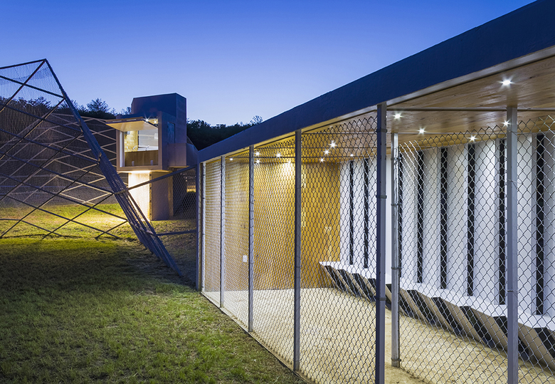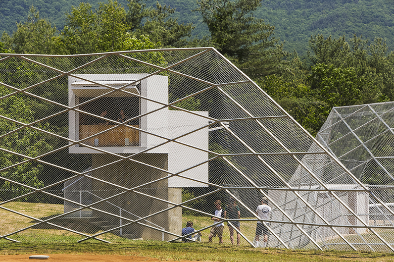 The dugouts are cool, white oak lined shelters from the hot summer sun. Their back walls are sliced, folded and skewed, creating benches and privacy screens for the players and coaches while inviting breezes and filtered light. The field equipment storage rooms are white cubes with full height, full width vertical axis bi-fold doors. When closed, they disappear into anonymity; when open they become extensions of the fields. The press boxes take the form of a single tower to maximize efficiency. The boxes themselves are expressed independently at the top of the tower, each prospecting its own field. Horizontal axis bi-fold doors rise on electric motors to create a shade canopy for the score keepers and perforated steel stairs allow natural light to filter deep into the concession stand at the tower’s concrete base. In the evening, points of white light emerge as a constellation on the oiled oak ceilings of all the buildings.
