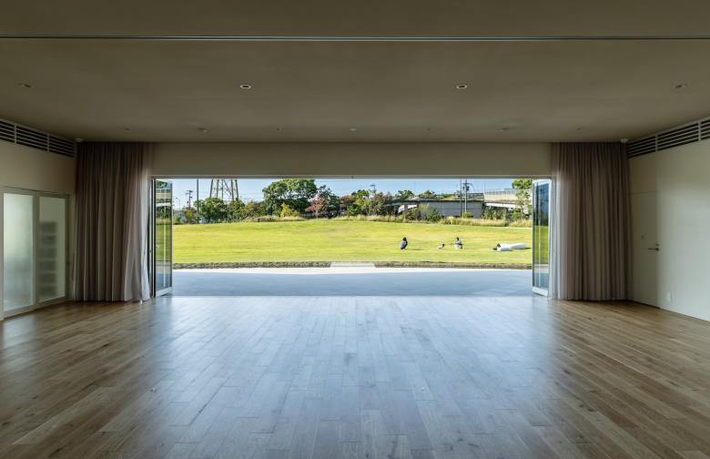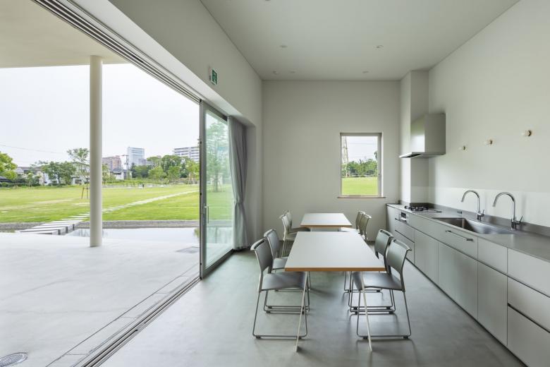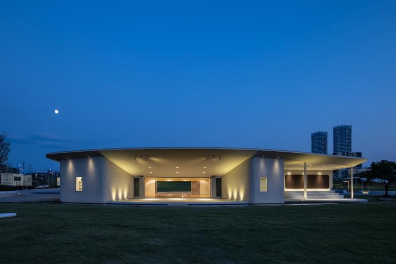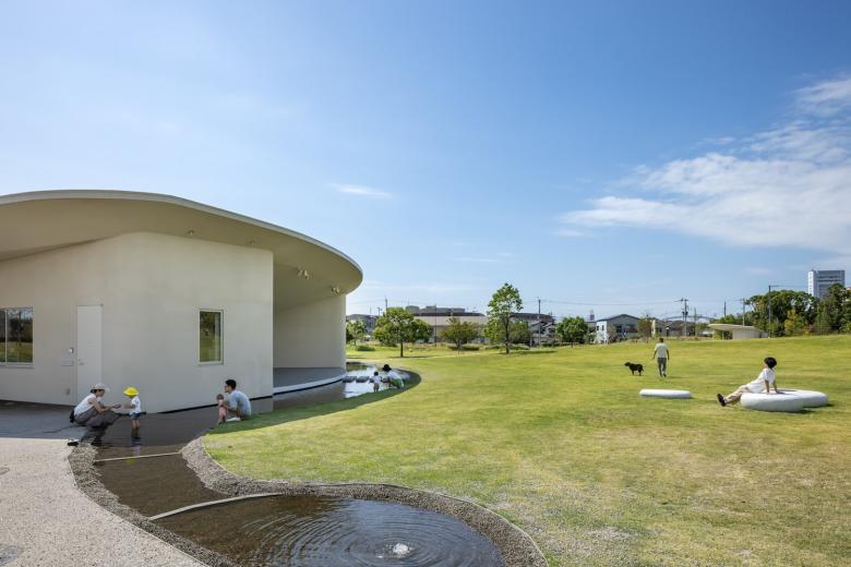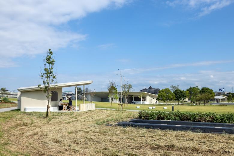 パークセンターは、かたちとしても、アクティビティの受け皿としても、公園のランドスケープと一体的にデザインしている。活動を支える多目的ルームやワークショップスペースから半屋外広場、そして屋外の「すりばちシアター」へと、パークセンターから屋外へ連続的に空間がつながる構成とし、使い方によって利用者が自ら環境をチューニングできる仕組みを設けた。多目的ルームは、利用者やプログラムにより、折戸を開くことで「すりばちシアター」と一体で利用可能とし、同時に室内の可動間仕切りによって、ルームの広さを変えることも出来る。またワークショップでの意見をもとに、公園内の多様な活動を支える備品置き場や、緑地管理の方の休憩所として使用する倉庫の面積や数を決定した。またシーパスパークには、さくらエントランス、パークエントランス、ガーデンエントランスの三方向から出入りできることから、パークセンターには、ランドスケープやアンジュレーションの柔らかな雰囲気と呼応する曲線の大屋根を設け、裏側を設けない設計とした。