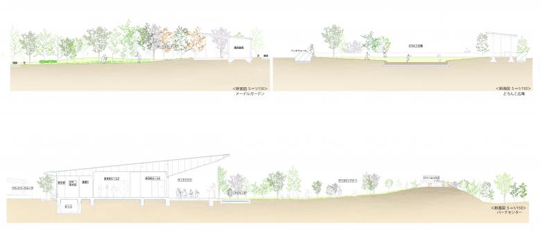 ランドスケープは、パーク全体が連動して、多様なアクティビティを受け入れる「うつわ」のような場所となるように、「すりばちシアター」や「おおはらっぱ」とパークセンターの関係性、周辺環境への開き方を考慮し、建築とランドスケープを一体的にゾーニングしている。パークセンターのデッキテラスを、敷地北西にある大阪臨海線や阪神高速道路の方向へ開くことで、音楽の大きな音が高速道路等の交通によるホワイトノイズによって緩和される構成とし、敷地周辺の住宅地の方への騒音・視線の配慮として、「実りの森」や「シーパス山」の起伏を設けた。「すりばちシアター」の芝生面の傾斜は、イベント時にはフェスのように芝生に座りながら、デッキテラスで演奏されている音楽が聴ける場所となるだけでなく、パークセンターのデッキテラスの屋根が、「すりばちシアター」に対しての音響反射板となるように角度をつける等、建築とランドスケープが連動して多様なアクティビティを受け入れるデザインを徹底した。敷地は地下水位が高く、平坦な既存地形に対して、高木を植える際には盛土を行う必要があることから、各々の「うつわ」の使われ方に応じたアンジュレーション(地形の起伏)を加え、イタリア、シエナ市のカンポ広場のような、普段使いの居心地のよい場所になっている。アンジュレーションの起伏の高さを、パーク内を歩いている方々の目線からは少し隠れる最大1.2m程度とし、曲線のベンチを設けることで、柔らかな「うつわ」の縁が形成され、各々の場所性を高める効果を持たせている。
