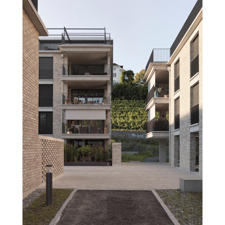 Eine gelungene Siedlung des Winterthurer Architekturbüros Dahinden Heim Partner Architekten aus rund 120 Eigentums,- und Genossenschaftswohnungen, die mir durch die vielfältigen Aussenraumabfolgen, Durchblicke, Höfe und Nachbarschaften eine wirklich sehr kurzweilige Aufnahmezeit vor Ort beschert hat und mir als Architekturfotograf durch die Strukturen, die Kombinationen aus Sichtbeton und Klinkerstein-Sichtmauerwerk und einem wirklich bemerkenswerten Boden eine Steilvorlage nach der anderen bot.