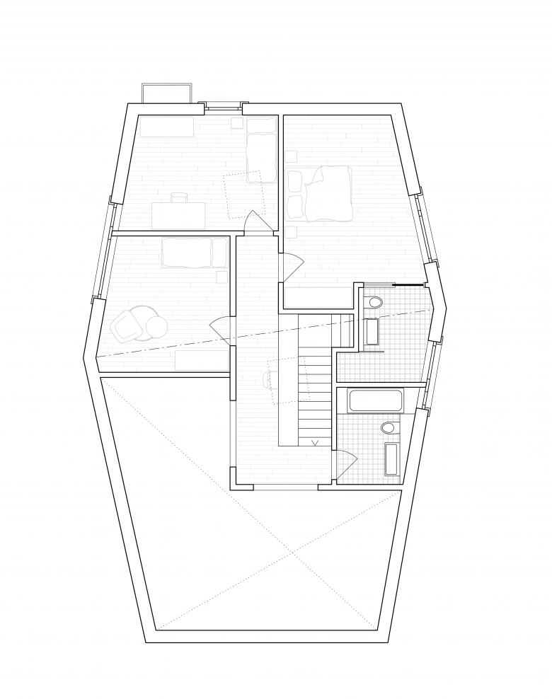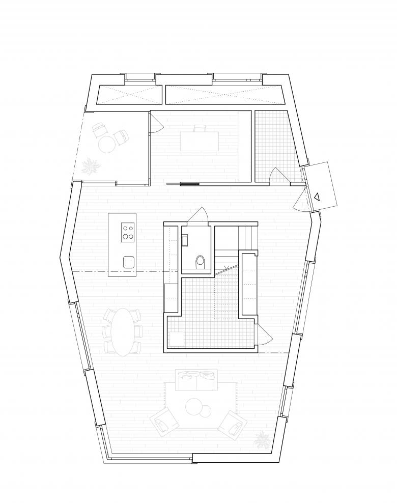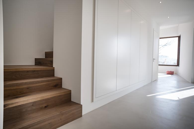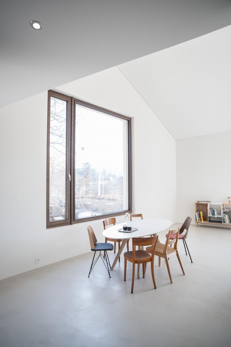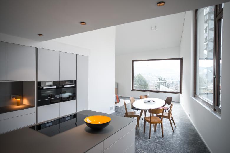 Während die untere Hausreihe reine 5.5-Zimmer Einfamilienhäuser sind, beherbergt die obere Reihe jeweils eine zusätzliche Wohnung, die über einen Aufzug aus der Einstellhalle hindernisfrei zugänglich ist. Im Innern zeichnen sich die Häuser durch offene Wohnküchen, überraschende Raumhöhen und fliessende Übergänge aus.