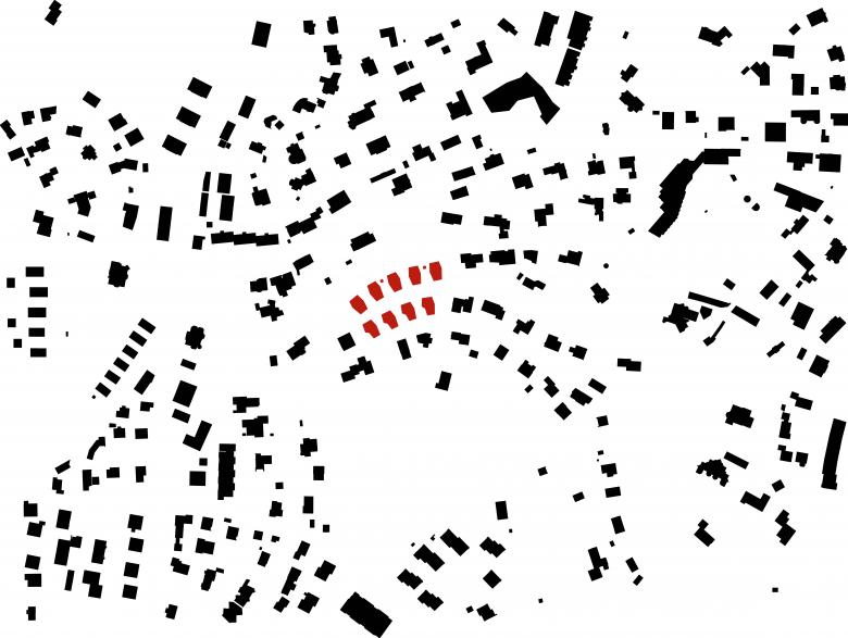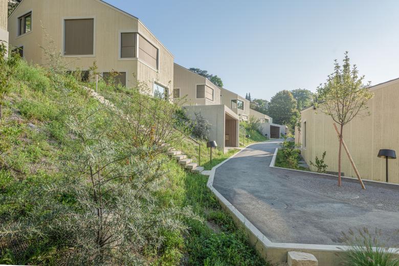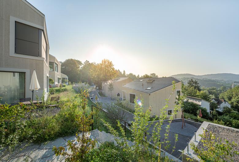 Die Überbauung ist in den steilen Hang eingebettet und folgt dem natürlichen Geländeprofil. In der Verlängerung der Friedbergstrasse entstand eine autofreie Spielstrasse. Die präzise Setzung und abgewinkelten Grundflächen der Häuser schaffen grosszügige gemeinsame Freiräume und private Rückzugsorte.