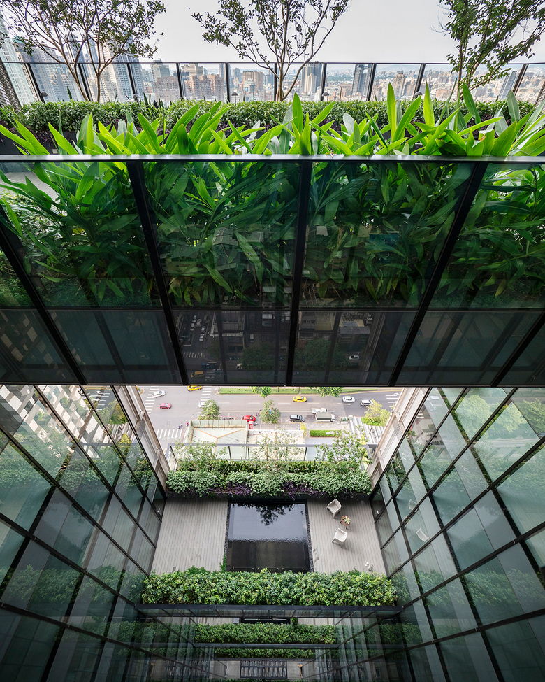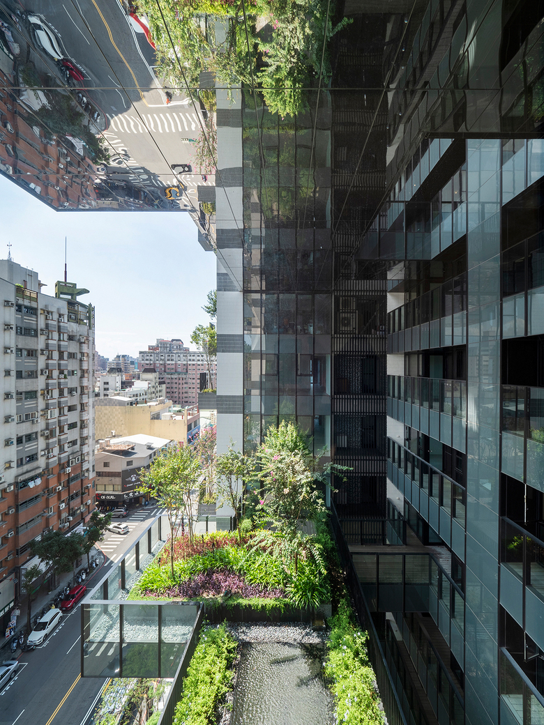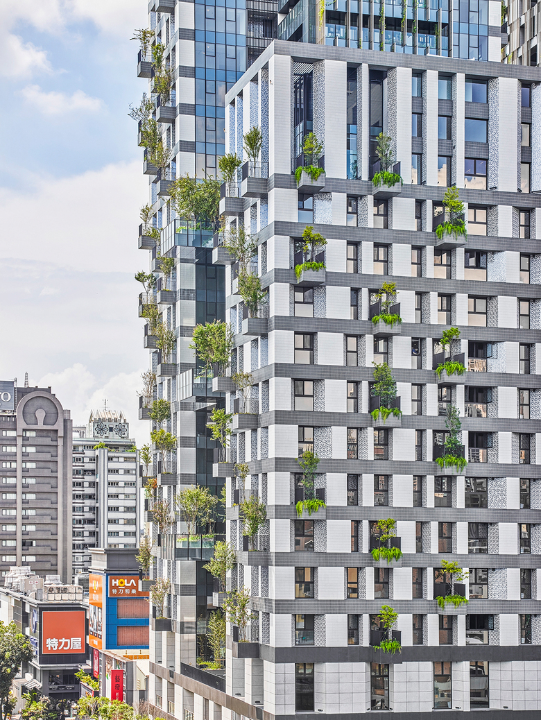 Sky Green is a mixed-use development located at the heart of Taichung in a densely developed and vibrant neighborhood. The site is made up of two rectangular plots, one facing the main city thoroughfare, Gongyi Road, and the other facing Naying Street, a quieter secondary street. The development consists of two 26-storey residential towers with apartment units from level 4 onwards, as well as retail spaces. To connect to its setting, and the hustle and bustle of the streets, the building’s retail spaces are located from ground level to level 3. The shops have staggered patterned glass cladding to give an urban backdrop to the tree-lined pedestrian walkways and modern outdoor street furniture.