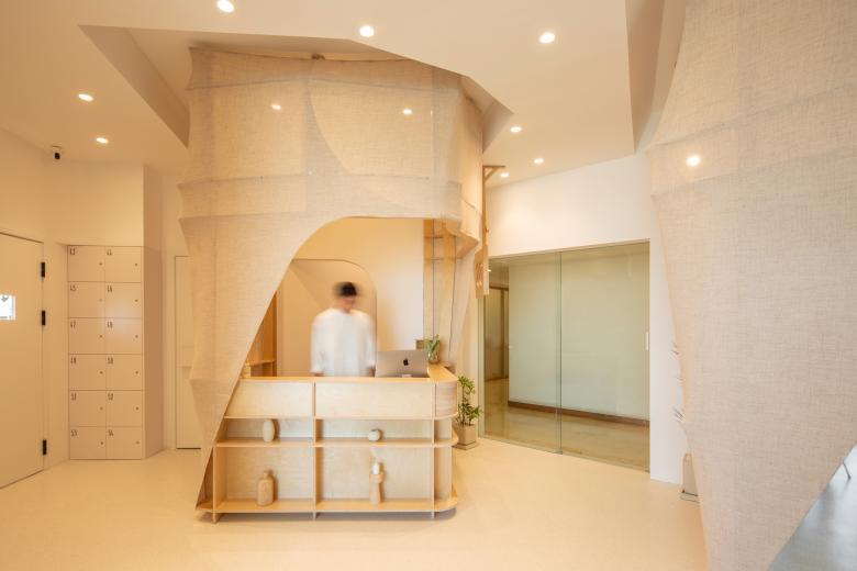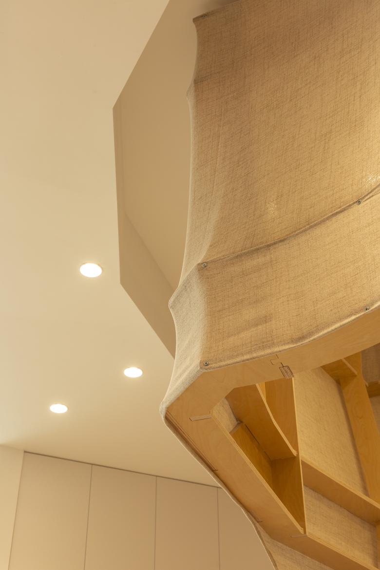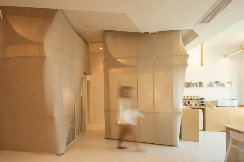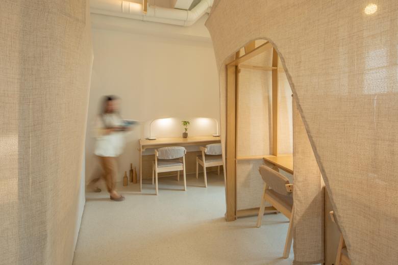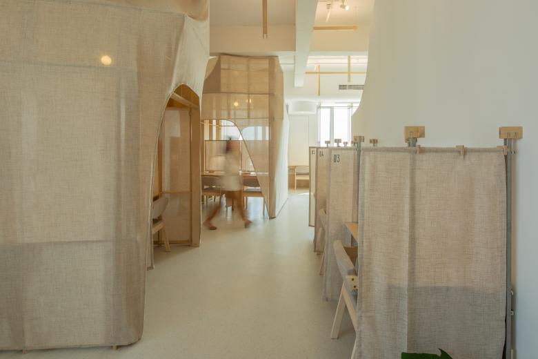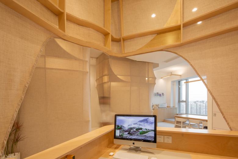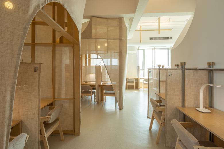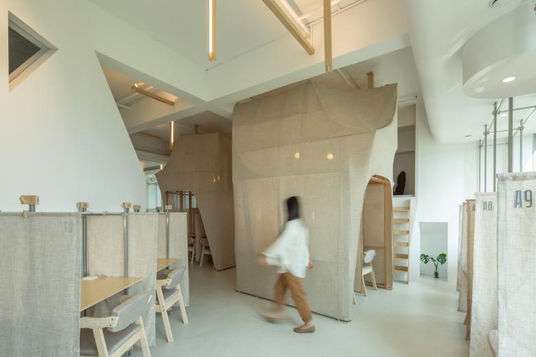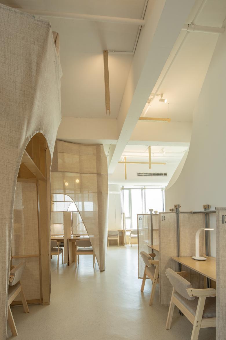 这里的风景,不是生硬地搬弄造型,不是临摹景致;这里的天际注定是在近处的,举手登高便可及;这里的光影注定是人文的,点线交织;这里的景致注定是抽象的,棱角分明。我们在整体的空间中植入了五个互相映照的体块,分布于公共区和自习区,它们串联起了空间的功能流线——前台接待、双人研讨、多人自习,也建立起了整体风景的脉络。我们有意的将体块拔高,升高的体量似乎带来了类似“景观”的形象作用。但往往高大的形态会给人产生一种疏远的距离感,特别是在讲究高效利用的功能空间中,这种距离感,反而把空间引向了逼仄,人与人之间的关系也更加紧张。通过造型上的不断推敲,我们发现在向上的延伸过程中,体量微微向外展开,形成上大下小的势态能给人带来一种遮蔽感,这很像峡谷、大树的意向。而为了体块的造型能更加的柔和,并且最大化的抵消形态给人的压力,我们避开了传统硬质建造材料,选择亲和肌理的布料作为体块的外衣。我们设计了特定的造型轮廓语言,通过将预制的木构件拼装组合成支撑骨架,再覆盖布料塑形和收紧,有意将骨架的轮廓线显现形成一种柔软的张力。在这件柔软外衣下,似乎也由一个坚实的身体——当我们穿行于空间中,偶尔地驻足相遇,像是来到了一个巨大的身体遮蔽下。