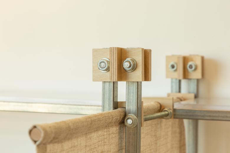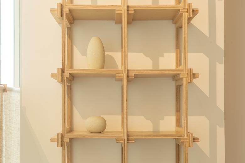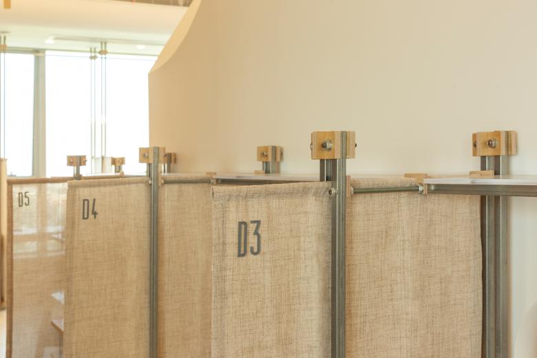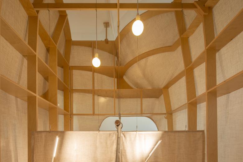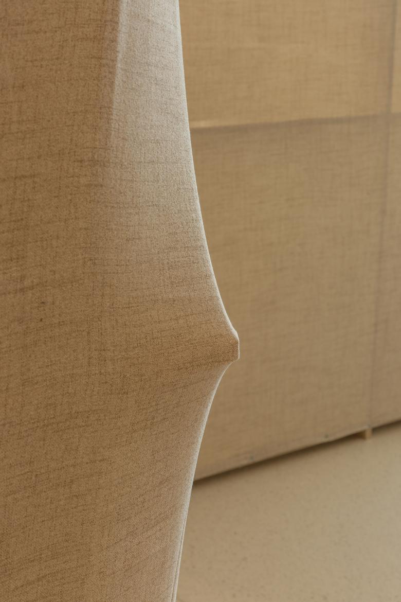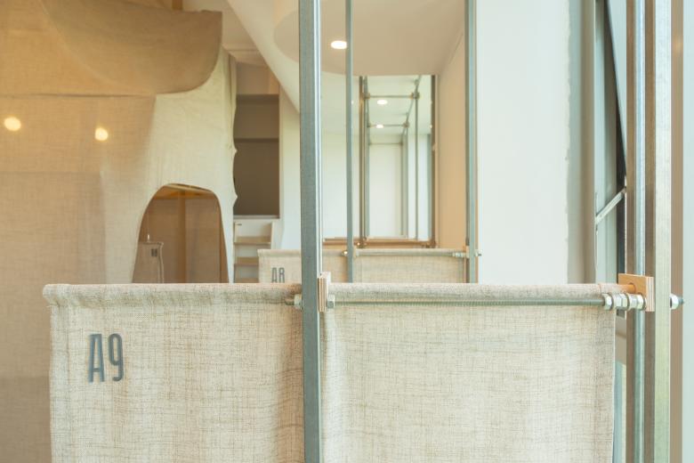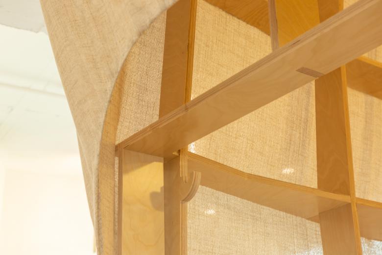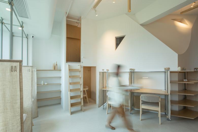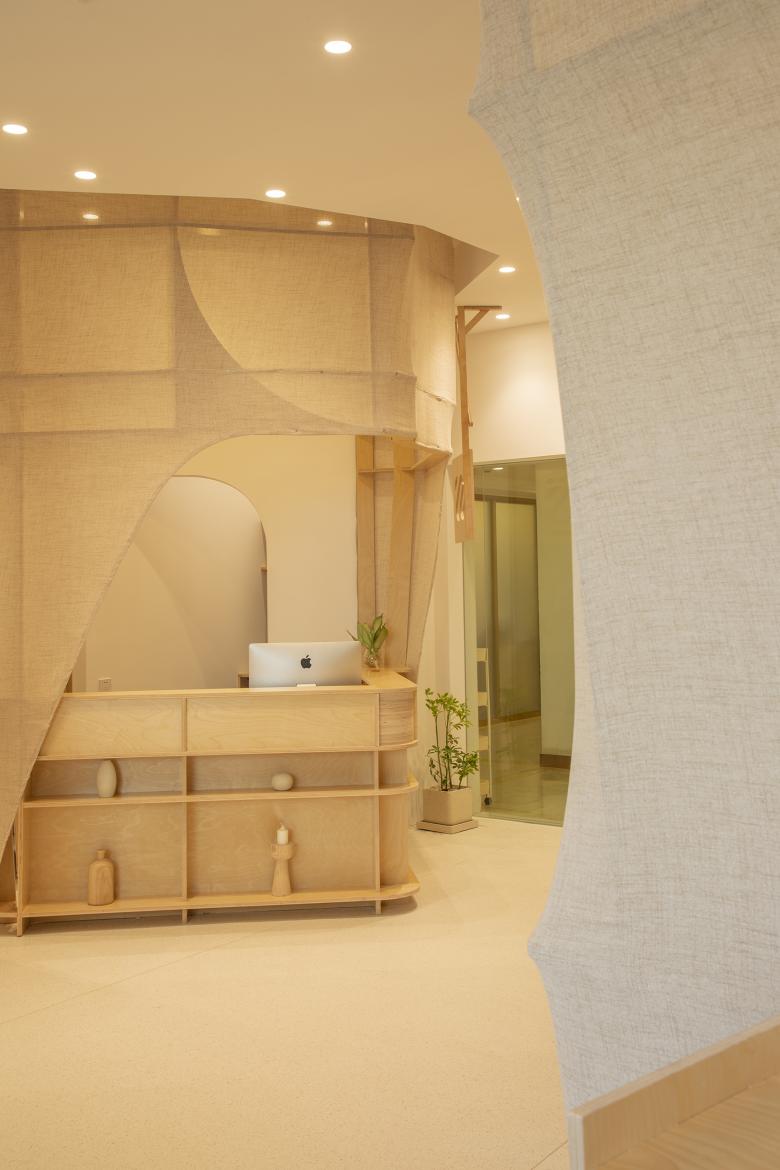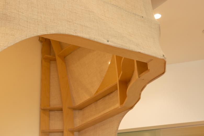这里的风景,不是生硬地搬弄造型,不是临摹景致;这里的天际注定是在近处的,举手登高便可及;这里的光影注定是人文的,点线交织;这里的景致注定是抽象的,棱角分明。我们在整体的空间中植入了五个互相映照的体块,分布于公共区和自习区,它们串联起了空间的功能流线——前台接待、双人研讨、多人自习,也建立起了整体风景的脉络。我们有意的将体块拔高,升高的体量似乎带来了类似“景观”的形象作用。但往往高大的形态会给人产生一种疏远的距离感,特别是在讲究高效利用的功能空间中,这种距离感,反而把空间引向了逼仄,人与人之间的关系也更加紧张。通过造型上的不断推敲,我们发现在向上的延伸过程中,体量微微向外展开,形成上大下小的势态能给人带来一种遮蔽感,这很像峡谷、大树的意向。而为了体块的造型能更加的柔和,并且最大化的抵消形态给人的压力,我们避开了传统硬质建造材料,选择亲和肌理的布料作为体块的外衣。我们设计了特定的造型轮廓语言,通过将预制的木构件拼装组合成支撑骨架,再覆盖布料塑形和收紧,有意将骨架的轮廓线显现形成一种柔软的张力。在这件柔软外衣下,似乎也由一个坚实的身体——当我们穿行于空间中,偶尔地驻足相遇,像是来到了一个巨大的身体遮蔽下。