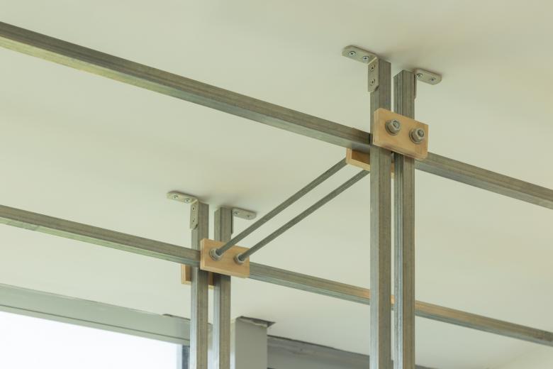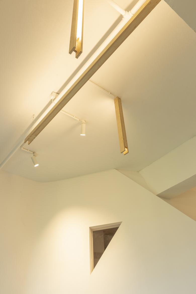 研讨室是对隔音及私密性要求比较高的空间,为此,我们在围合空间上运用了更多的实墙,以满足使用者对体量厚重感的心理需求。而当体块外部穿上布料外衣后,我们利用布料与实墙间所形成的腔体作为照明位置,当光源从腔体内透出,清晰的月牙型轮廓和虚化的纵横龙骨阴影,交织地投射在布的表面上,产生了一种照明条件下的轻盈,与研讨室内部的塔型空间的厚重形成了互补。而在开放自习区的照明设计上,我们设计了拼装式线型灯具、大跨度的悬挑结构及钢丝绳的运用,发光的开口位置尽量避开人的视线,减少光源的存在感,让灯具在高空中还原成一个个纵横交错的木构件,弱化了光源的视觉含义,最大化的将顶面营造成一个个发光面域。悬浮的木构、晕染开的光线,将自习区营造出一种轻盈、静谧的氛围。