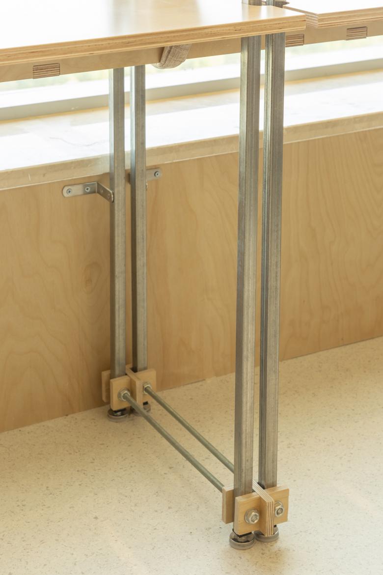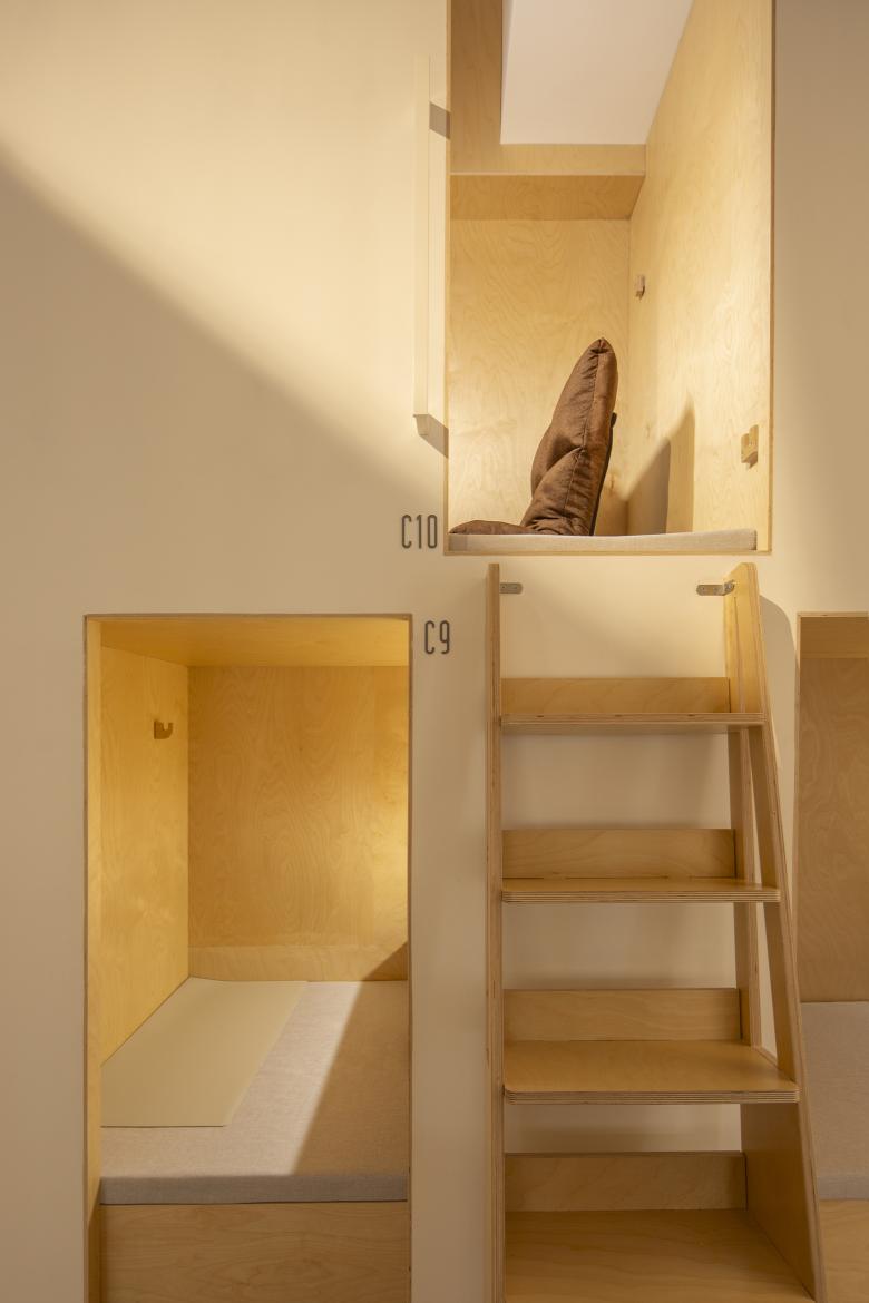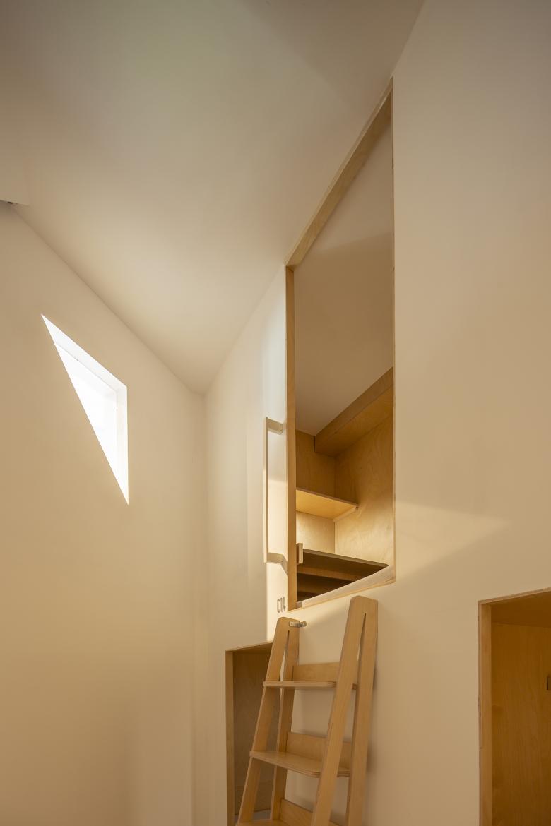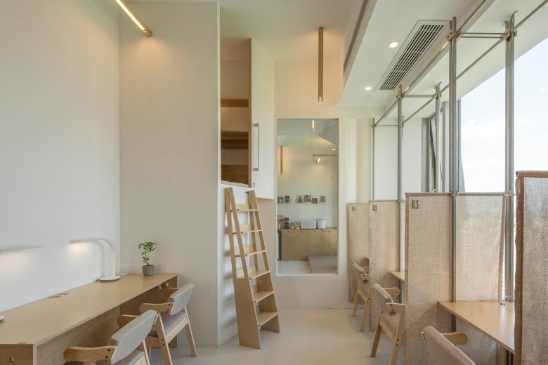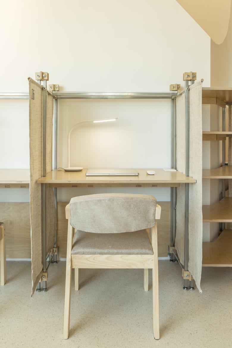 自习区的私密性一直是自习空间的诉求,我们想在个体的私密性和整体空间中找到一种平衡。为了保证单独座位的私密使用,我们在单人桌间设计了可收纳的布隔帘,临界于视平线的高度让自然光线和人的视野能够延伸至远端;在开放区和自习区的隔墙上,我们留出了一个通高的玻璃面,同时在微光区的墙面转角处创造了一个独特的三角形开口,并且在自习明区的角落里又竖起了二层塔楼空间。这与自习区的两个布衣体块的不同开口朝向相得益彰,使人与人的视线在休憩时被分散到空间的各个角落,看与被看间,思绪也游离出了案头。