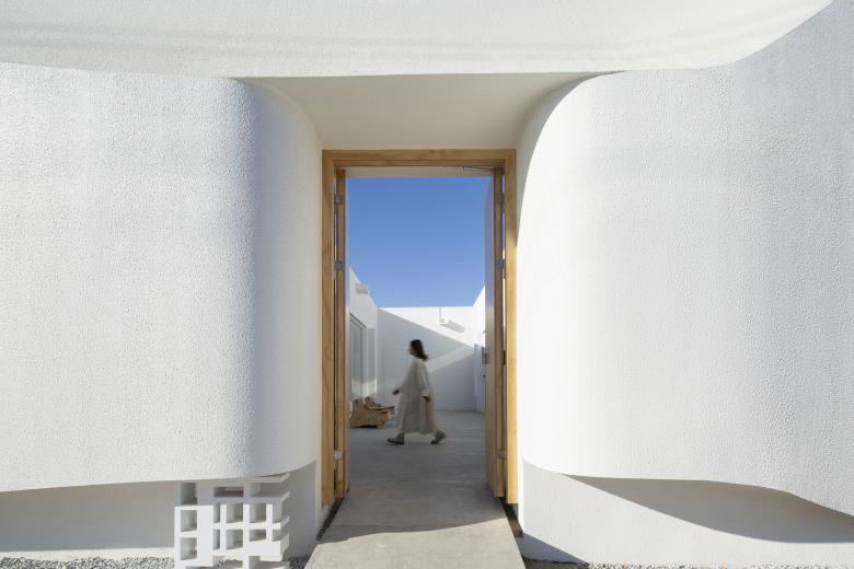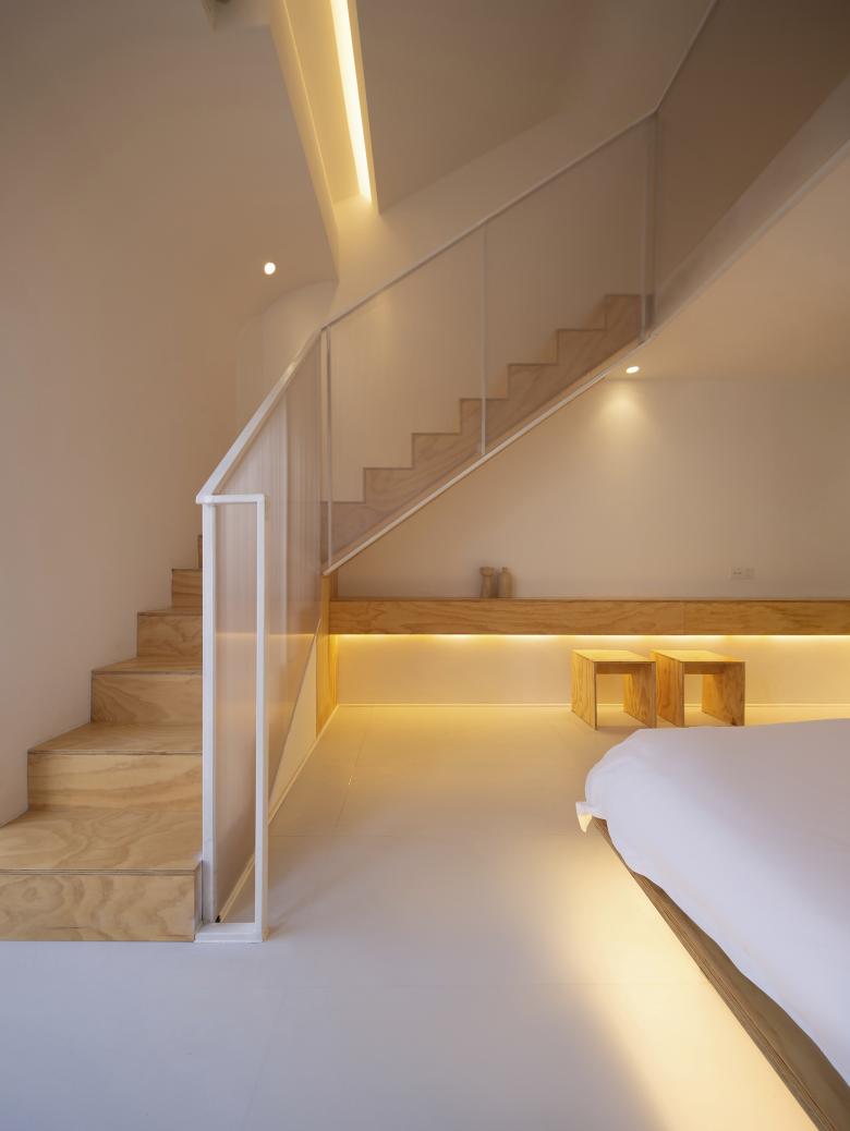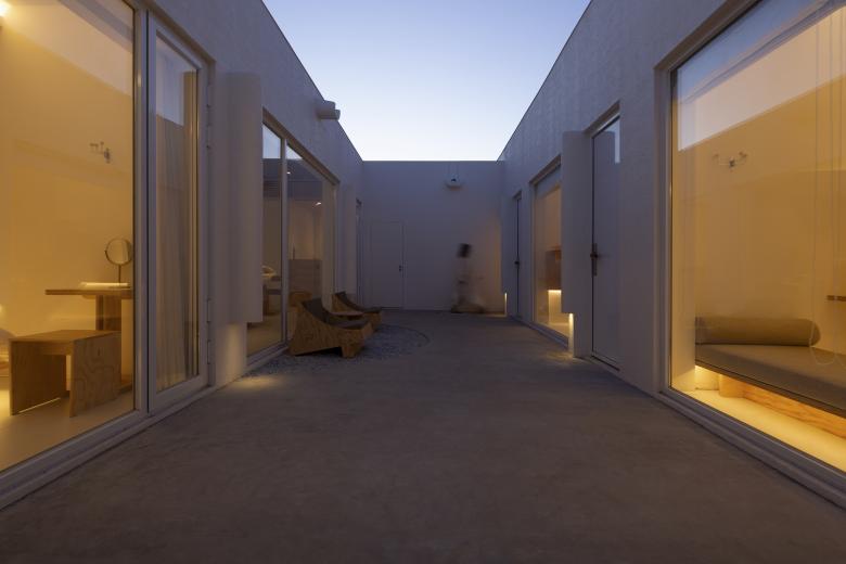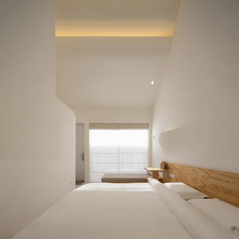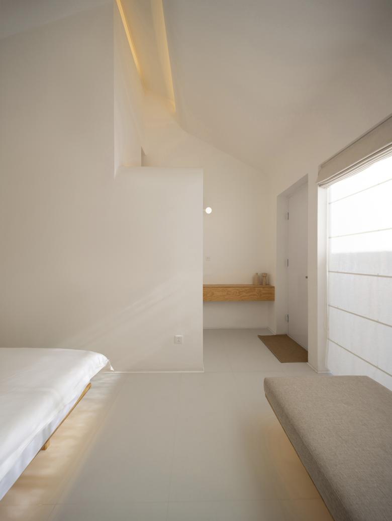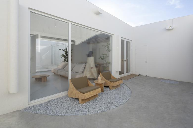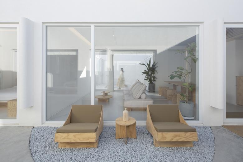 两个院子原本就存在于建筑之中,皆给人以内向宁静的氛围。我们将前院定义为开放空间,左右两侧的建构形式对称且有秩序,塑造出了极具精神性的纯白院落空间。后院则相对封闭,主要为客人提供一个具有一定私密性、可供放空发呆的室外活动空间。而大厅空间成为了连接前后两个院子的媒介,大块透明的落地玻璃面使光和视线得以贯穿。