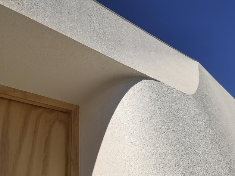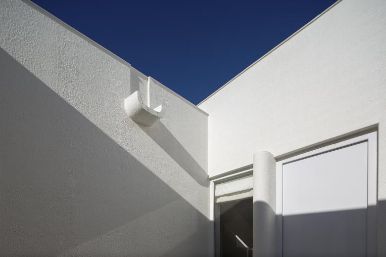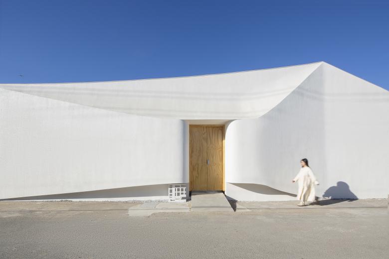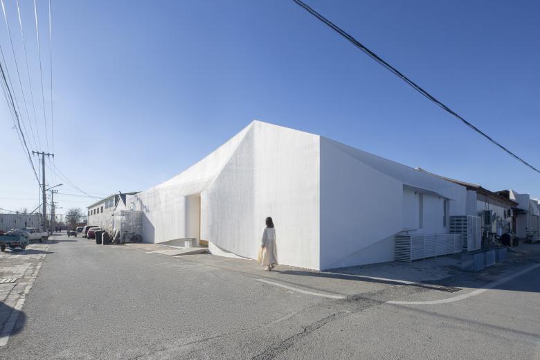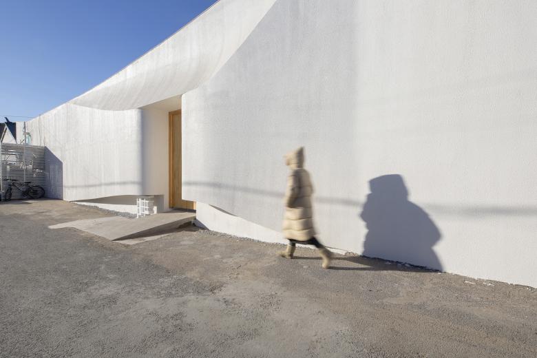 在我们的设计中时常强调三个关键词,流动、衔接、延伸。几何体量流动的关系,以及建筑在场域中的气质,一直是我们的关注重点,也是我们的设计惯性,这种惯性是无意识的并且随着时间在不断转变。起初,建筑外墙的沿街立面凌乱不堪,平顶与坡顶房的山墙面生硬拼接,呈现出随意、单调的沿街景象。为扭转这一局面,重塑位于主要路口建筑的形象,赋予其体量感与可辨识度,我们进行了深入的推敲。先是给予建筑一个微微向前的力,并以入口门洞的四个角为起点向四周延伸至建筑的边缘,塑造出全新的结构线,随后将这些线条柔化,形成一个内凹形的入口灰空间,使扁平的墙体有了几何雕塑感,静态的建筑有了流动感。这个充满流动感的入口,既实现了雨棚的功能,又不见雨棚,完美地融入到了建筑的身体。而这些流动的线条与一望无际的白色,为建筑赋予了诗意与惊喜之感