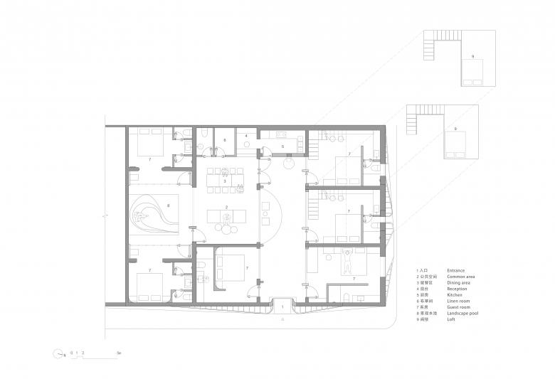 平面布局大体维持了原本建筑的关系框架。由于前一任租户已砌好了客房的隔墙,为了节省成本,我们只能基于此进行房间分配。在充分考量流线与动静分区后,我们将前院平房的三个开间中,两间合并为一个公共空间,设置了休息区、餐厅、前台、布草间、卫生间。坡顶房的三个开间里,其中两间已有用于隔层的钢结构,我们继续将其打造成 LOFT 家庭房。公区大厅的位置一经确定,两个院子便与其共同成为整个场地的核心区域,为四周的客房提供服务。