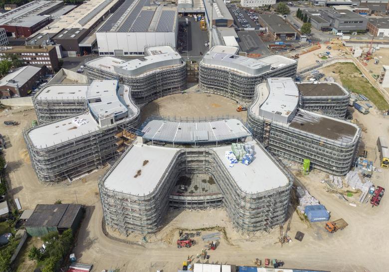 Der Weltmarktführer SMS Group will in seiner neuen Unternehmenszentrale in Mönchengladbach die Zukunft der Arbeit vorleben. In dem Gebäudekomplex verbinden sich Technik, Natur und Transparenz. Während sich die Empfangshalle mit Vorfahrt in Richtung des Stadtzentrums öffnet, sind die Gebäudeteile mit den Büros zu einer Parklandschaft hin ausgerichtet. Gläserne Wege verbinden auf mehreren Ebenen die Nachbargebäude. Die Transparenz und Offenheit des Gebäudes holt die Natur in die Arbeitswelt. Der SMS Campus besteht aus 5 Einzelmodulen, die sich auf einem ca. 66.000 m² großen Grundstück erstrecken. Der Innenhof hat einen Durchmesser von 65 Metern und die Gebäude eine Höhe von 16 Meter. Alle Module sind über ein spektakuläres Membrandach miteinander verbunden, das mit einem Durchmesser von 82 Meter auch den Innenhof komplett überspannt. So entsteht im Zentrum des Campus ein weitgehend wettergeschützter, heller Raum. Dieser besondere Platz im Herzen der Anlage ist der zentrale Treffpunkt für das Unternehmen. Das Parkhaus mit 1500 Plätzen liegt hinter einem grünen Hügel. Es bietet ausreichend Stellplätze für Pkw, Motorräder und Fahrräder und wird mit Ladestationen für E-Autos und E-Bikes ausgestattet sein. So bleibt das Gelände selbst autofrei. Jede Etage des Gebäudes bietet insgesamt Raum für 100 bis 120 Arbeitsplätze. Ein Konferenzzentrum mit großem, teilbarem Saal ermöglicht Besprechungen und Meetings mit bis zu 500 Teilnehmern. Die Bürogebäude verfügen zudem über eine Vielzahl an Sozialeinrichtungen. Im Sommer 2023 wird das Gebäude übergeben. Neues zur Baustelle gibt es fortlaufend aktualisiert auf unserer Website www.hartmann-architekten.de in der Rubrik Baustaub.