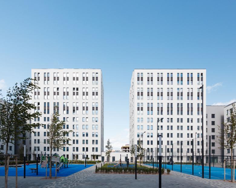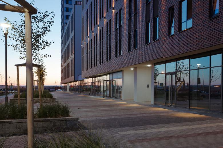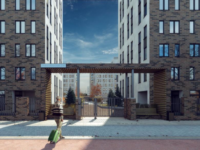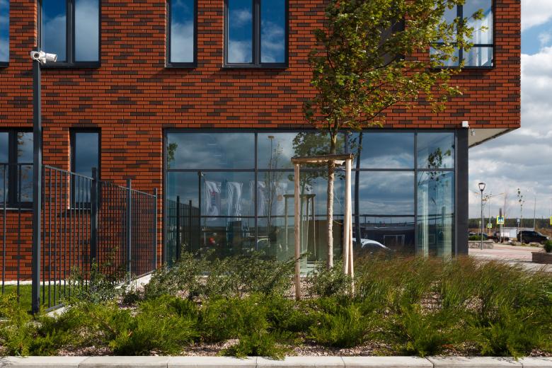 Экономика жилья стандарт-класса потребовала точных и сильных фасадных решений. Уличные фасады отделаны клинкерным кирпичом. Дворовые фасады контрастно белые, с ритмическим рисунком матрицы окон. На их фоне проявляется озеленение и благоустройство двора, занимающие в этом пространстве центральное место.