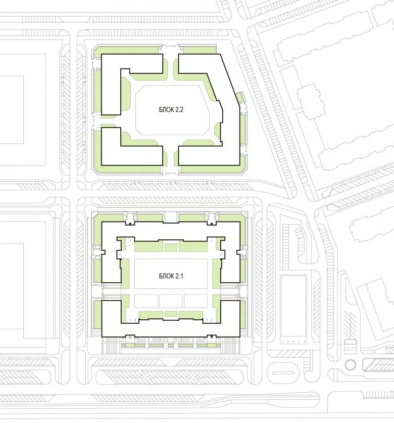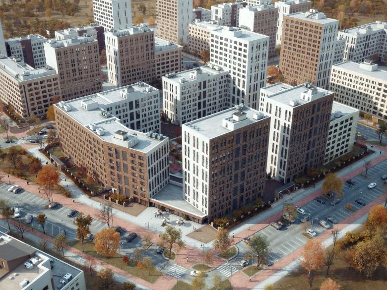 Корпуса разной этажности с просветами по периметру. Это создает образ защищенного квартала, сохраняя при этом визуальную связь между улицей и двором.
