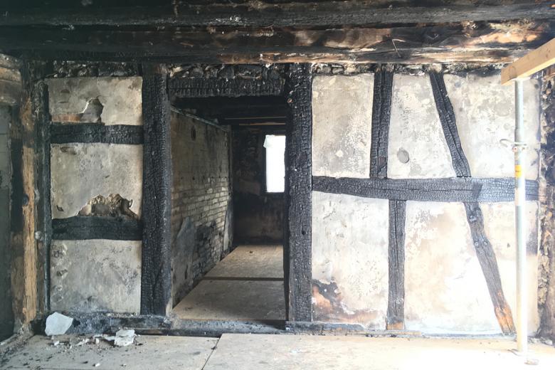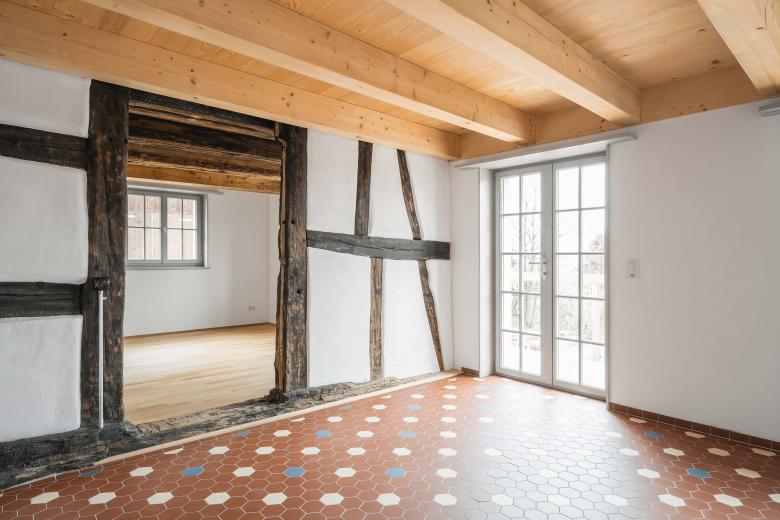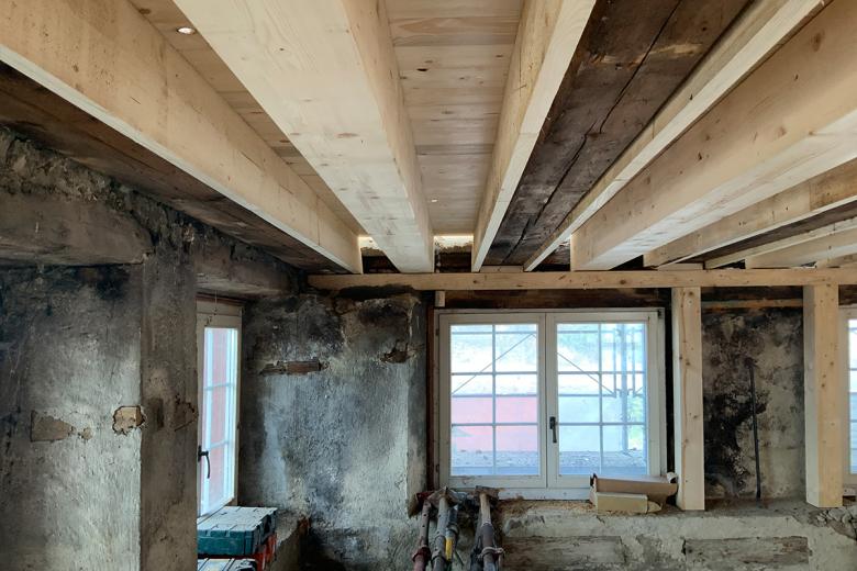 Im Oktober 2019 brannte in Niederneunforn das Wohnhaus und die angrenzende Scheune aus. Nach sorgfältiger Zustandsanalyse, Planung und Sicherungsarbeiten konnte nach zwei Jahre mit der Sanierung des denkmalgeschützten Gebäudes begonnen werden.
