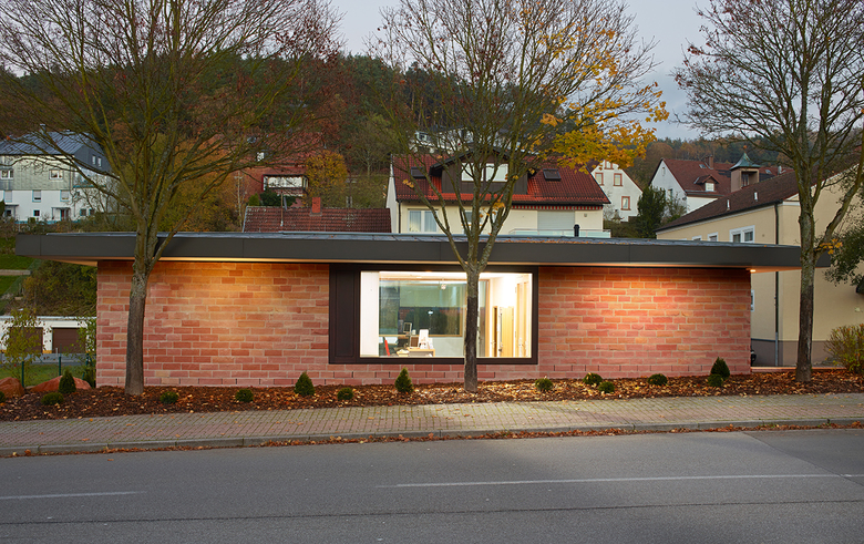 Der im Juni 2013 fertiggestellte Neubau befindet sich auf einem bereits bestehenden Platz und wertet diesen architektonisch auf. Die eingeschossige Pavillon-Architektur mit dem markanten, weit auskragenden Dach entwickelt sich aus der bestehenden Umfassungsmauer heraus und schließt das nördliche Ende des Platzes ab. Durch die Platzierung der Sparkassenfiliale am rückwärtigen Ende des Platzes bleibt viel öffentlicher Raum erhalten.