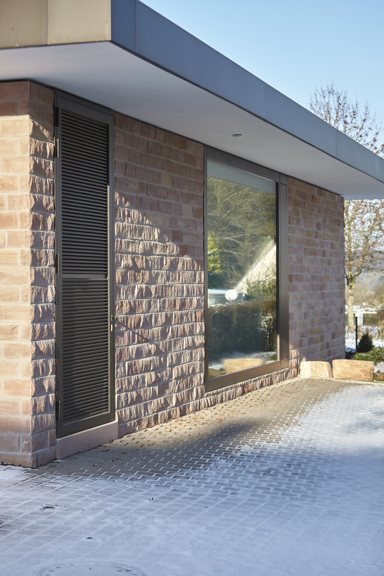 Die Außenwände wurden als zweischalige Mauerkonstruktion aus tragenden Ortbetonscheiben, mittiger Dämmung und einer Verblendmauerschale in Buntsandstein von fallenden Längen ausgeführt. Die Verblendung der Vorsatzschale ohne tragende Funktion wird durch die Schattenfugen deutlich, mit denen der Sandstein an begrenzende Bauteile anschließt. Die Fenster wurden fassadenbündig mit einem Dämmrahmen versehen. Eine bodennahe Lüfterreihe gewährleistet eine ausreichende Luftzirkulation hinter der Verblendschale.