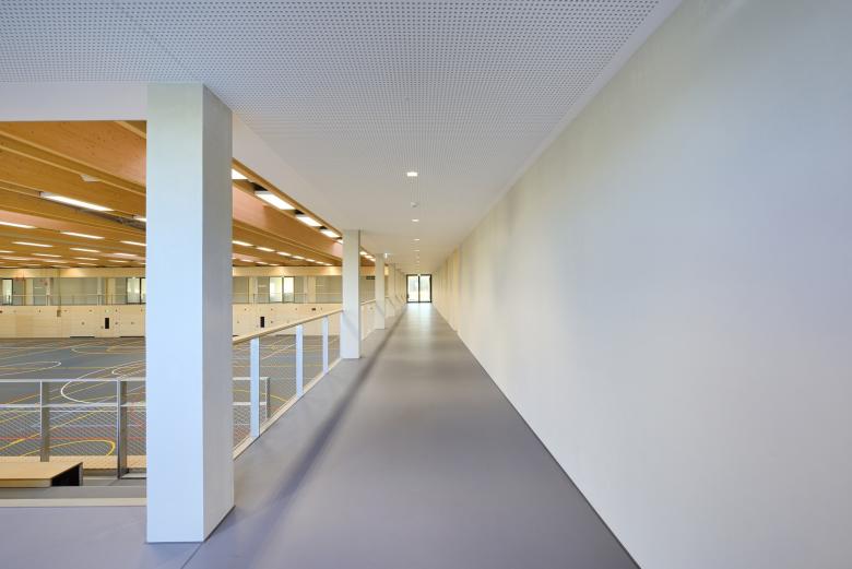 Auf der Eingangsebene sind drei Eingänge angelegt: Der Schülereingang von Nordwesten mit fußläufiger Anbindung an die Mittelschule, der Sportlereingang und der Zuschauereingang im Süden als Zugang vom Parkplatz. Die Zuschauer- und Tribünenbereiche werden über das Foyer schwellenlos angebunden. Die Spielfeldebene ist um die Höhe der Tribüne um ca. 3,25 m zur Zuschauerebene abgesenkt. Die Fest- und Teleskoptribünenplätze werden von den Besuchern über den Zuschauergang erreicht. Die Stehplätze befinden sich rund um die Halle entlang des arkadenartigen Stützenumgangs. Der Umkleidetrakt im Westen wird durch Sportler- und Schülereingang über einen Sportlergang erschlossen. Von den Umkleide- und Sanitärbereichen sind die drei Einzelhallen über drei Treppen zu erreichen. Im Untergeschoss sind neben dem Sportfeld mit Übermaß von 46 x 30 m u.a. großzügige Sportgeräteräume und Lagerräume für mobile Tribünen und Bühnen sowie Technikräume vorgesehen.