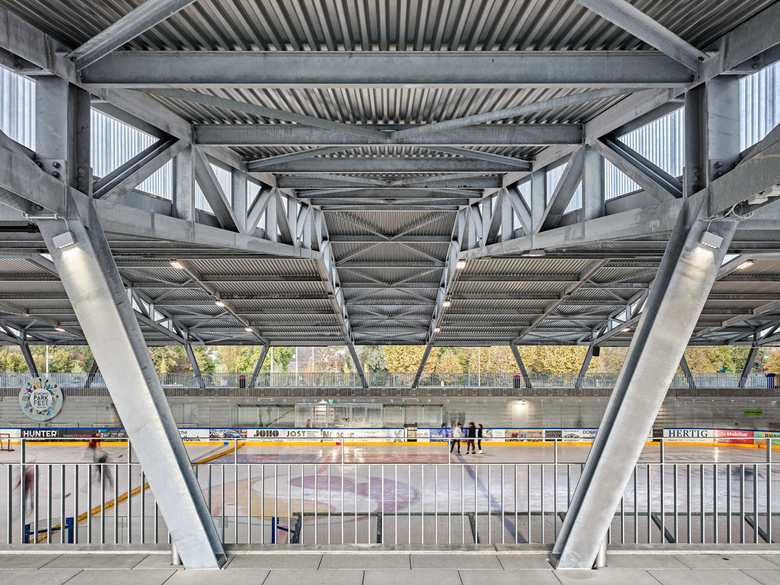 Das Gartenbad Wohlen ist ein bedeutender Zeitzeuge der 60er Jahre Architektur. Die markanten Pilzstützen beim Eingangsbereich aus Sichtbeton sowie die skulpturale Ausbildung der Beckenränder und -Übergänge verleihen der Anlage einen unverwechselbaren Charakter. Auch der stattliche Baumbestand sowie die markanten Geländeaufschüttungen um die Schwimmbecken prägen die Anlage. Der Eingriff im Eingangsbereich orientiert sich an der bestehenden Bausubstanz. Die ursprünglichen Qualitäten des Kassen-, Kiosk- und Restaurantgebäudes werden durch Rückbau störender und nachträglich angebauter Elemente wieder erlebbar gemacht. Durch gezielte und subtile Eingriffe an den bestehenden Sichtbetonmauern und Familiengarderoben werden die vorderen Bereiche der heute überdimensionierten Garderobenzone einsichtig gemacht und können so in neue Funktionen (Sandkasten, Open-Air Bibliothek, Grillstellen) überführt werden. Die schöne und grosszügige Parkanlage bleibt weitgehend unverändert und wird nur örtlich an den Rändern durch zusätzliche Bepflanzungen ergänzt und verdichtet. Das vielschichtige Angebot des Sportparks spricht sämtliche Bevölkerungsschichten an und deckt ein breites Angebot ab. Die Parkflächen, die Begegnungszonen um die Pilzstützen, die ehemalige Eisbahnfläche und die neue Eishalle bieten zudem eine ideale Plattform für kreative Ideen, Veranstaltungen und Zwischennutzungen. Der neue Haupteingang zum Sportpark wird durch den Neubau der Eishalle akzentuiert und bildet zusammen mit der Sportanlage Niedermatten eine identitätsstiftende Adresse für Sport und Freizeit. Das neue überdachte Eisfeld wird 4-seitig eingeschossig umbaut und bietet eine zentrale Infrastruktur mit Garderoben, sanitären Einrichtungen und Gastronomie. In der dem Schwimmbad zugewandten kurzen Gebäudeseite werden konsequent alle Räume untergebracht, die sowohl vom Publikum der Eisbahn als auch des Schwimmbades und der Nebensportanalgen genutzt werden. Dadurch können die Synergien zwischen den Anlageteilen maximal ausgenutzt werden. Dank einem dynamischen Gastronomiekonzept können die Gäste im Winter wie im Sommer und bei unterschiedlicher Auslastung der Anlage optimal mit hoher Qualität bewirtet werden. Das Eisfeld ermöglicht eine 6-monatige, durchgängige Nutzung der natürlich belichteten Eisfläche sowie eine hohe Eisqualität.