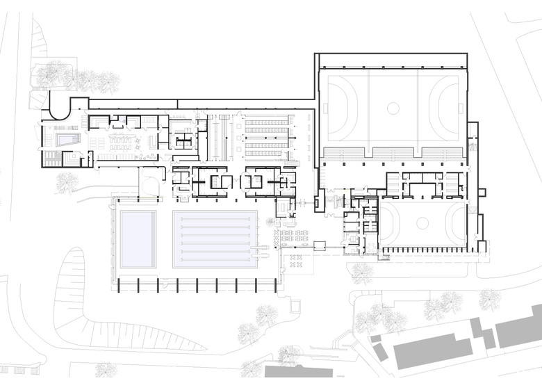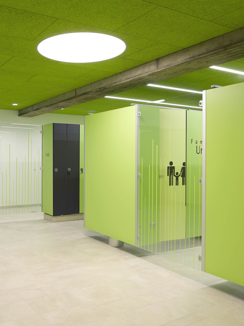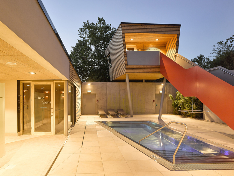 Ziel der Sanierung des Sportzentrums war es, die Attraktivität des Bades und der zwei Sporthallen zu steigern und den Wohlfühlfaktor zu erhöhen sowie das Gebäude aus den 70er Jahren technisch auf den aktuellen Stand zu bringen. Die Sanierung war in zwei Bauabschnitte unterteilt. Im ersten Schritt wurden die zwei Sporthallen sowie die Badehalle mit Nebenräumen und Technik saniert sowie die Außenanlagen teilweise neu gestaltet. Der zweite Bauabschnitt umfasste die Umstrukturierung und komplette Sanierung des Saunabereichs mit Baumhaus-Sauna und Saunagarten. Für die energetische Optimierung wurden sämtliche Glasfassaden im Gebäude ausgetauscht. Die charakteristische Dreiecksform der Badehalle prägt nach wie vor den Gebäudekomplex. Ziel war es, das Sportzentrum mit geringfügigen baulichen Eingriffen hinsichtlich der funktionalen Anforderungen und atmosphärischen Wirkung maximal zu verbessern. Dafür wurden neue Raumaufteilungen geschaffen und die Wegeführung im Foyer und den Nebenräumen optimiert. Die zeitgemäße Material- und Farbgestaltung verleiht dem Innenraum eine eigene Identität und sorgt im gesamten Gebäude für ein angenehmes Raumgefühl.