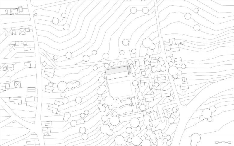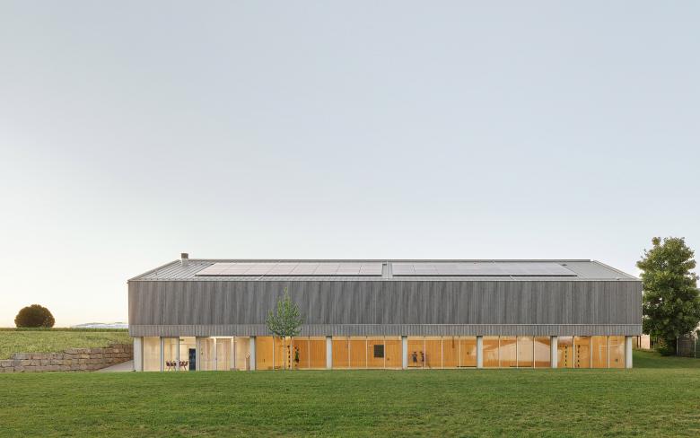 Das schmale, handtuchartige Grundstück, das Kindergarten, Schule und Baumäckerhalle vereint, fällt von Norden nach Süden stark ab. Die gewählte Position des Neubaus schließt das Grundstück nach Norden hin ab und öffnet mit einer bodenbündigen Glasfront großzügig den Blick nach Süden auf den Rasenplatz. Der kompakte Baukörper nutzt die Topografie des Geländes, ein Teil der Nutzungen verschwinden im Hang, wodurch sich Baumasse und Höhenentwicklung moderat entwickeln. Die Sporthalle wird von Grün umspielt und die Freianlagen sind naturnah gestaltet.