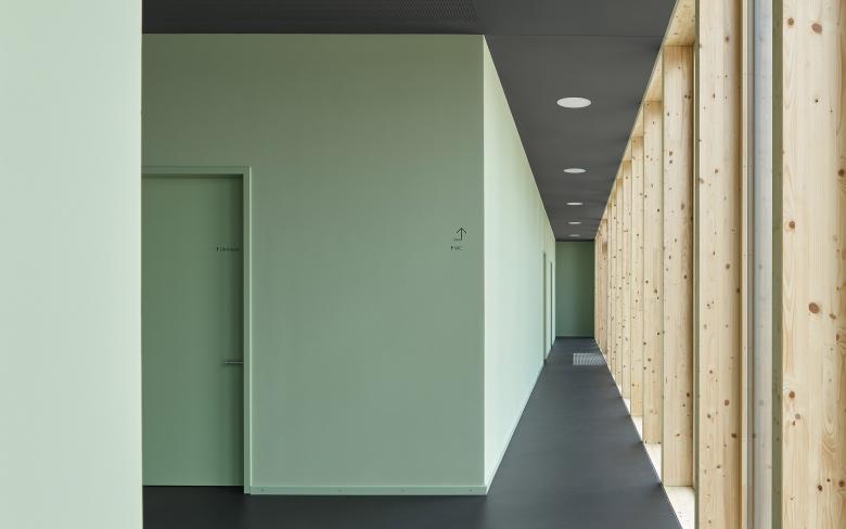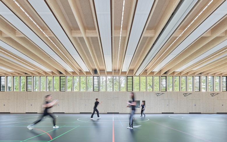 Für den Holzbau wurde ein wirtschaftlicher, ressourceneffizienter Ansatz gewählt: Filigrane Stützen und Träger aus Brettschichtholz bilden im Achsabstand von 1.25 Meter das Primärtragwerk der Spielhalle. Auf Nebenträger, bzw. eine Substruktur in der Fassade kann somit verzichtet werden. Das fein gegliederte Tragwerk bestimmt die Raumwirkung.