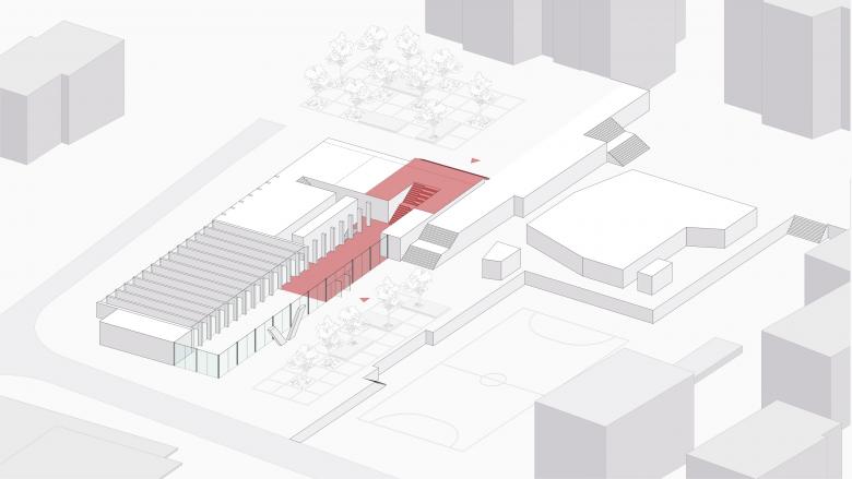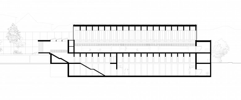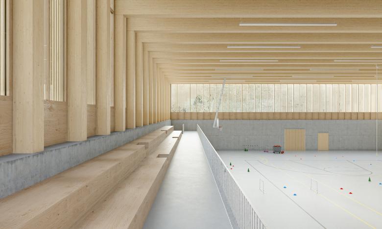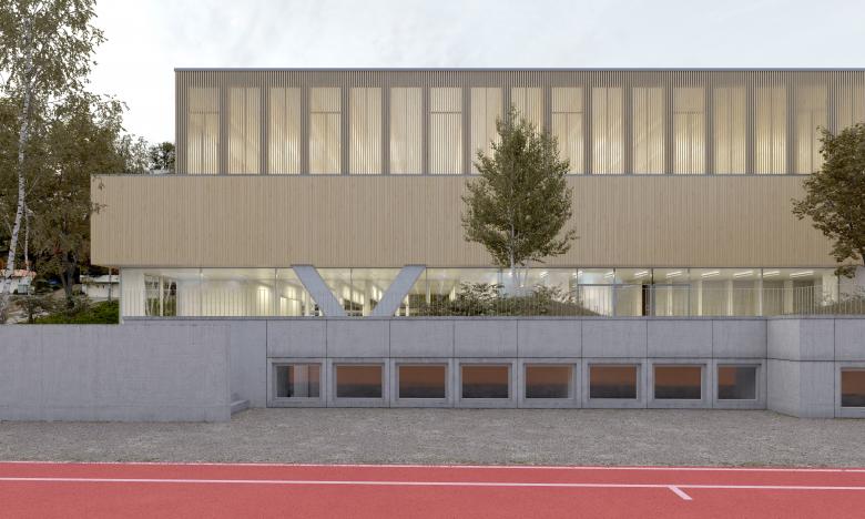 Die neue Sporthalle aus Holz folgt der Materialisierung der geplanten Schwimmhalle. Beide sind Ausdruck eines verstärkten Umweltbewusstseins in der Verwendung von nachwachsenden Baumaterialien. Sie erweitern den Materialkanon der Schulanlage mit ihrer Aluminiumfassade aus den 70er-Jahren und des neuen Gemeindesaals mit seiner Kunststeinfassade aus den 10er-Jahren.