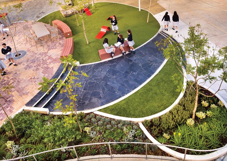 The key elements of this courtyard included an active outdoor auditorium for conducting engaging group activities, green banks to complement the sports court, a piazza influenced flexible use space, a new light and bright shade canopy, a contemporary representation of a shade providing tree and extensive but subtle night lighting.