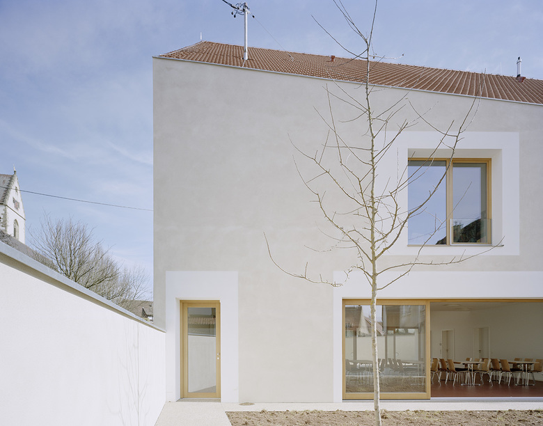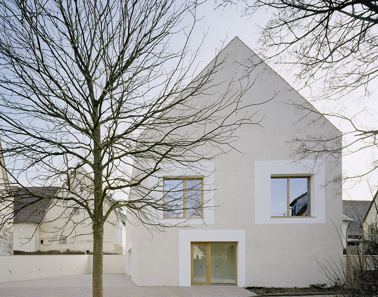 Ein Steildach mit Biberschwanzdoppeldeckung und verputzte Wandflächen stellen Bezüge zum ländlichen und traditionellen Bauen her. Wenige, großflächige Öffnungen mit Putzfaschen lassen Ein- und Ausblicke zu.