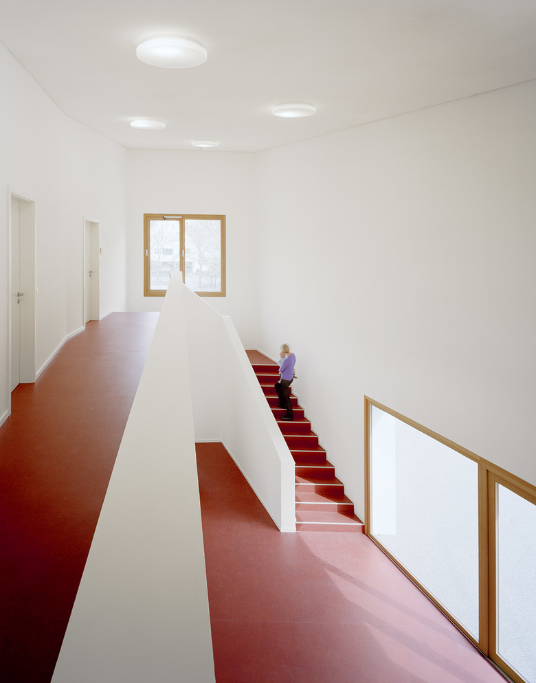Die Oberflächen des Innenraums sind glatt und fugenlos. Sie kontrastieren mit der äußeren Gestalt des Baukörpers. Im Foyer lässt sich das Gebäudevolumen räumlich erfassen. Die Galerie im Obergeschoß erinnert an eine Gasse, von der aus drei Stuben erschlossen werden.