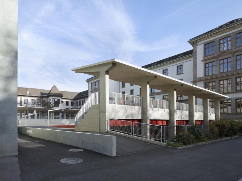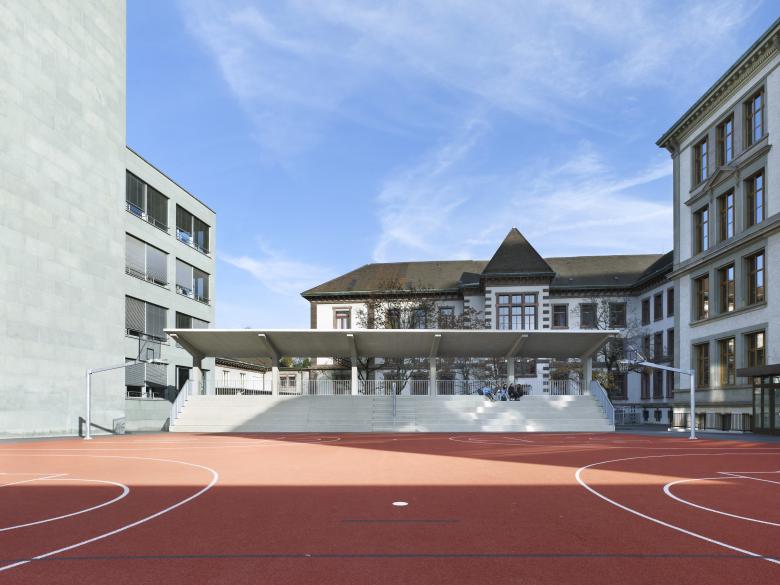 Mit wenigen Eingriffen wurde der Schulhof von oberirdischen Aufbauten wie Oberlichter, einem Brunnen und Pflanztrögen, sowie den alten Dämm- und Belagsschichten befreit. Der neue Aufbau wurde gedämmt und abgedichtet, um das erneute Eindringen von Wasser zu verhindern. Darauf wurde für die Befahrbarkeit der Fläche eine 12 cm dicke Betonverteilplatte installiert und die an die umliegenden Gebäude angrenzenden Flächen mit Walzasphalt geschlossen. Auf dem neuen, offenen Platz wurden zwei Basketballfelder aus rotem Kunststoffbelag angelegt. Die Sitztreppen wurden bis auf ihre Tragstruktur zurückgebaut, erneuert und mit zwei überdachten Zuschauertribünen ergänzt. Sie erstrecken sich über die ganze Breite des Spielfeldes und bilden einen stadionartigen Raum, der den Schulen und dem ganzen Quartier zur Pausen-, Sport- und Freizeitnutzung zur Verfügung steht.