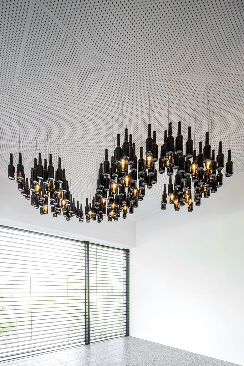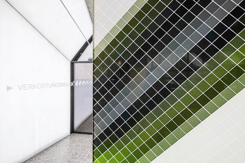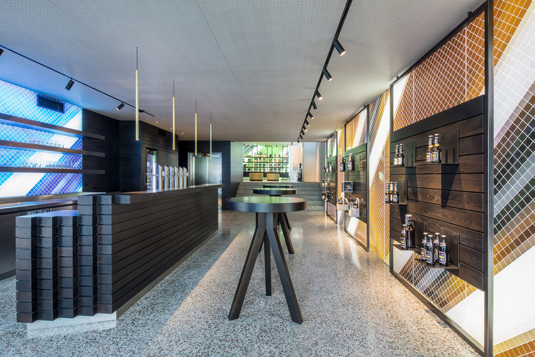 Die großflächigen hinterleuchteten Grafiken beruhen auf Makroaufnahmen von grünem und braunem Glas von Bierflaschen, während eine blaue Mutation des gleichen Sujets der Zonierung der Bereiche Ausstellung, Verkostung und Verkauf dient.