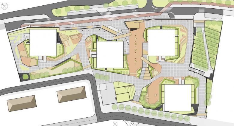 Через стилобат проходит «каньон» – пешеходная лестница, ведущая от автобусной остановки, на двор комплекса, к лыжной базе и лесопарку. На лестницу выходит двухсветный вестибюль, кафе, фитнес, салон красоты и другие коммерческие помещения.