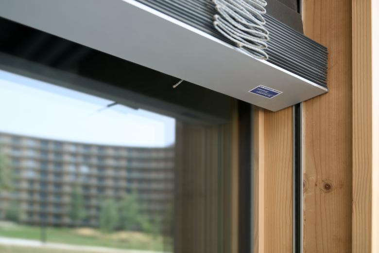 An der Aussenfassade wurden als ästhetischer, dezenter Sonnenschutz Verbund-Raffstoren VR 90 gewählt. Auch diese sind service- und wartungsfreundlich. Gleichzeitig überzeugen sie mit einer geräuscharmen und einfachen Bedienung. Ihre spezielle Lamellen-Formgebung bietet eine gute Abdunklung und hervorragende Isolation. Dadurch leisten sie einen wesentlichen Beitrag zum Energiesparen und sorgen für ein angenehmes Raumklima und ein gutes Wohlbefinden.