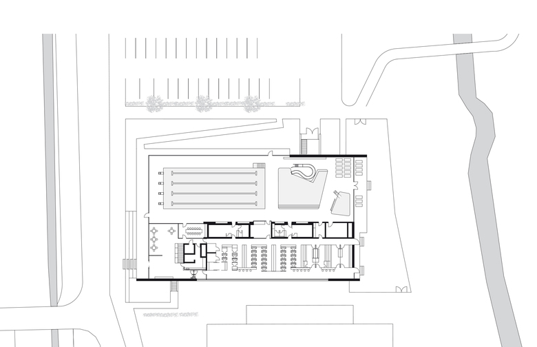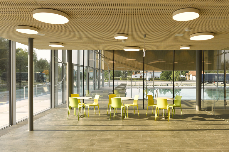 Die klare Grundriss-Organisation von Badehalle und Umkleidebereich ermöglichte eine kompakte und ökonomische Bauweise mit einem günstigen A/V-Verhältnis. So lassen sich nicht nur die Baukosten, sondern auch die Kosten im Betrieb reduzieren. Keller- und Erdgeschoss sind in Stahlbeton ausgeführt, die Tragstruktur für die weit gespannte Badehalle und den Umkleidebereich wurde in Holzbauweise errichtet. Auch die abgehängten, akustisch wirksamen Lamellen-Decken und Wandverkleidungen sind in Holz ausgeführt. Aufgrund seiner positiven Eigenschaften und seiner natürlichen Anmutung eignet sich das Material besonders gut, um Räumen mit schallharten Flächen wie Badehallen Atmosphäre zu verleihen und die Raumakustik zu optimieren. Darüber hinaus sorgte der hohe Vorfertigungsgrad der Holzelemente für eine wirtschaftliche Bauweise und kürzere Bauzeiten.