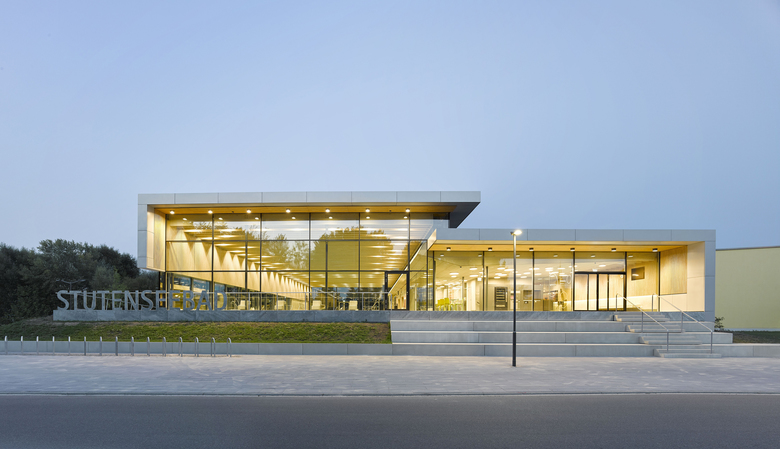 Im Vordergrund der Planung für das neue Schwimmbad stand, ein gestalterisch überzeugendes und qualitativ hochwertiges Gebäude mit langer Lebensdauer zu errichten. Deshalb wurde der Neubau unter Anwendung der Nachhaltigkeitskriterien im staatlich geförderten kommunalen Hochbau entwickelt (Förderprogramm NBBW). Der kompakte Baukörper mutet von außen schlicht an, im Innenraum herrscht eine leuchtend helle Atmosphäre, die mit maximaler Aufenthaltsqualität überzeugt. Architektonisch gliedert sich das Stutensee-Bad in zwei Raumvolumen, die sich sichtbar von außen abzeichnen. Die geräumige Badehalle umfasst ein Schwimmerbecken, ein Lehrschwimmbecken mit Rutschbahn sowie einen Kleinkindbereich mit insgesamt 368 m² Wasserfläche. Der nach Süden angrenzende Eingangs- und Umkleidebereich mit Dusch- und Nebenräumen setzt sich durch eine reduzierte Raumhöhe von der Badehalle ab. Dabei greifen die zwei Baukörper in Form und Materialität ineinander und verzahnen sich von außen durch ein umlaufendes Band der Stahlblechfassade.